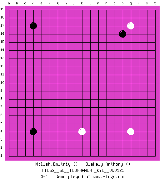 Last move : 0-1 2011 September 16 22:26:4 [Event "FICGS__GO__TOURNAMENT_KYU__000125"] [Site "FICGS"] [Date "2011.08.10"] [Round "1"] [Black "Malish,Dmitriy"] [White "Blakely,Anthony"] [Result "0-1"] 1.d17 q4 2.d4 q17 3.p16 k4 0-1 This go game has been lost on time (started : 2011.08.10 16:39:6) Here are the names of the openings (joseki) played in the four corners : Corner q16 : q17 p16 Komoku (Somok, Xiao~mu`) 3-4 Point. The komoku (3-4) point is the traditional corner enclosure move.. Player White won this Go (weiqi, baduk) game. Follow this game move after move (download)Learning josekis by heart is useless if you don't try departing from them. (Pierre Audouard) This is where the fun begins. (Anakin Skywalker in Star Wars ep.3)