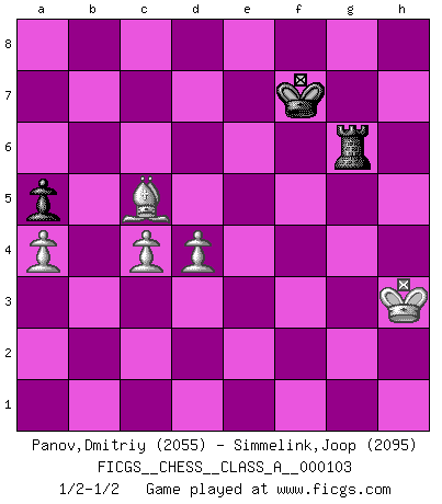 Last move : 1/2-1/2 2011 October 7 7:24:45 [Event "FICGS__CHESS__CLASS_A__000103"] [Site "FICGS"] [Date "2011.08.11"] [Round "1"] [White "Panov,Dmitriy"] [Black "Simmelink,Joop"] [Result "1/2-1/2"] [WhiteElo "2055"] [BlackElo "2095"] 1.e4 e5 2.Nf3 Nc6 3.Bb5 a6 4.Ba4 Nf6 5.O-O Be7 6.Re1 b5 7.Bb3 O-O 8.c3 d5 9.exd5 Nxd5 10.Nxe5 Nxe5 11.Rxe5 c6 12.d4 Bd6 13.Re1 Qh4 14.g3 Qh3 15.Re4 g5 16.Qf3 Bf5 17.Bxd5 cxd5 18.Re3 Be4 19.Rxe4 dxe4 20.Qf6 Qg4 21.Qxg5+ Qxg5 22.Bxg5 f5 23.Nd2 Rae8 24.Kg2 Re6 25.Re1 Rg6 26.Bh4 Bf4 27.Nf1 Bh6 28.Be7 Re8 29.Bc5 f4 30.b3 Kf7 31.c4 bxc4 32.bxc4 Rf6 33.gxf4 Bxf4 34.Re2 Rg6+ 35.Ng3 e3 36.a3 h5 37.Kh3 Bxg3 38.hxg3 exf2 39.Rxf2+ Rf6 40.Rb2 Rc6 41.Rb3 Re2 42.Rb8 Rc2 43.g4 hxg4+ 44.Kxg4 Rf6 45.Rc8 Rg2+ 46.Kh3 Rfg6 47.Rf8+ Kg7 48.Rf3 R2g5 49.Kh2 a5 50.Bf8+ Kg8 51.Bc5 Rh5+ 52.Rh3 Rxh3+ 53.Kxh3 Kf7 54.a4 1/2-1/2 Ruy Lopez : Closed, 7...O-O Kingside Castling by player White (move 5) Kingside Castling by player Black (move 7) 10 pieces endgame at move 44 : White KRBPPP , Black KRRP WHITE : King + 1 Rook 1 Bishop 3 Pawns BLACK : King + 2 Rooks 1 Pawn 9 pieces endgame at move 52 : White KBPPP , Black KRRP WHITE : King + 1 Bishop 3 Pawns BLACK : King + 2 Rooks 1 Pawn 8 pieces endgame at move 53 : White KBPPP , Black KRP WHITE : King + 1 Bishop 3 Pawns BLACK : King + 1 Rook 1 Pawn This chess game ended in a draw. Follow this game move after move (download)Chess is a cold bath for the mind. (Sir John Simon) Der vorletzte Fehler gewinnt. (Savielly Grigorievitsch Tartakower) Haz el enroque temprano y seguido. (Rob Sillars) Le temps de noter son nom sur la feuille de partie, j'étais déjà en zeitnot ! D'un modeste amateur apparié lors de la première ronde d'un open contre le grand-maître Azmaïparashvili. Mandala - that's it! 16x16 squares as multiple of the four and the eight because of the Four Noble Truths and the Noble Eightfold Path. (Heinz-Georg Lehnhoff about Big Chess)