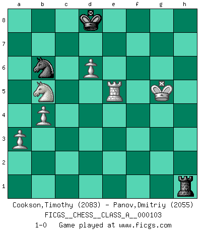 Last move : 1-0 2012 March 7 5:27:28 [Event "FICGS__CHESS__CLASS_A__000103"] [Site "FICGS"] [Date "2011.08.11"] [Round "1"] [White "Cookson,Timothy"] [Black "Panov,Dmitriy"] [Result "1-0"] [WhiteElo "2083"] [BlackElo "2055"] 1.e4 e5 2.Nf3 Nc6 3.Bb5 a6 4.Ba4 Nf6 5.O-O Be7 6.Re1 b5 7.Bb3 d6 8.c3 O-O 9.h3 Na5 10.Bc2 c5 11.d4 Qc7 12.Nbd2 cxd4 13.cxd4 Nc6 14.Nb3 a5 15.Be3 a4 16.Nbd2 Bd7 17.Rc1 Qb7 18.Nf1 a3 19.b3 Rfe8 20.Ng3 h6 21.d5 Nb4 22.Bb1 Na6 23.Qd2 Rec8 24.Rxc8+ Rxc8 25.Rc1 Bd8 26.Bd3 Ra8 27.b4 Ne8 28.Qc3 Nf6 29.Be2 Nc7 30.Nd2 Ra4 31.Bd1 Ra8 32.Rb1 Nce8 33.Rb3 Rc8 34.Qd3 Bb6 35.Ne2 Nh5 36.Rxa3 Nef6 37.Kh2 Ne8 38.Bxb6 Qxb6 39.Qe3 Qxe3 40.fxe3 Nhf6 41.Nc3 Kf8 42.Be2 h5 43.Nf3 Rb8 44.Ra7 Kg8 45.Ng5 g6 46.Kg3 Kf8 47.Kh4 Kg8 48.a3 Kf8 49.g4 hxg4 50.Bxg4 Nxg4 51.hxg4 Nf6 52.Nh7+ Nxh7 53.Rxd7 Rb6 54.g5 Ke8 55.Ra7 Rb8 56.Ra5 f6 57.gxf6 Nxf6 58.Kg5 Ke7 59.Kxg6 Rg8+ 60.Kf5 Rg3 61.Ra7+ Nd7 62.Nxb5 Rf3+ 63.Kg5 Rg3+ 64.Kh4 Rxe3 65.Ra6 Rxe4+ 66.Kg5 Re1 67.Rxd6 Rh1 68.Re6+ Kd8 69.d6 Nb6 70.Rxe5 1-0 Ruy Lopez : Closed Kingside Castling by player White (move 5) Kingside Castling by player Black (move 8) 10 pieces endgame at move 67 : White KRNPPP , Black KRNP WHITE : King + 1 Rook 1 Knight 3 Pawns BLACK : King + 1 Rook 1 Knight 1 Pawn 9 pieces endgame at move 70 : White KRNPPP , Black KRN WHITE : King + 1 Rook 1 Knight 3 Pawns BLACK : King + 1 Rook 1 Knight Player White won this chess game. Follow this game move after move (download)I believe that Chess possesses a magic that is also a help in advanced age. A rheumatic knee is forgotten during a game of Chess and other events can seem quite unimportant in comparison with a catastrophe on the chessboard. (Vlastimil Hort) Früher wurde jeder komplizierte Zug, jedes interessante Opfer mit großem Beifall und Enthusiasmus aufgenommen. Heute schaltet man einfach seinen Fritz an, und man kann sehen, was los ist, ob der Zug geht oder nicht. (Vladimir Kramnik) Las leyes del Ajedrez no permiten una libre elección: tienes que mover quieras o no. (Emanuel Lasker) Vouloir jouer aux échecs contre soi-même est aussi paradoxal que vouloir marcher sur son ombre. (Stefan Zweig) Coffee just isn't my cup of tea. (Unknown)
