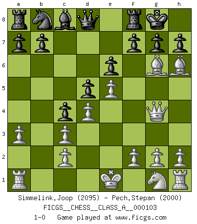 Last move : 1-0 2011 November 4 12:31:22 [Event "FICGS__CHESS__CLASS_A__000103"] [Site "FICGS"] [Date "2011.08.11"] [Round "1"] [White "Simmelink,Joop"] [Black "Pech,Stepan"] [Result "1-0"] [WhiteElo "2095"] [BlackElo "2000"] 1.e4 e6 2.d4 d5 3.Nc3 Bb4 4.e5 c5 5.a3 Bxc3+ 6.bxc3 Ne7 7.Qg4 O-O 8.Bd3 c4 9.Bh6 Ng6 10.Bxg6 1-0 This chess game has been lost on time (started : 2011.08.11 7:23:44) French : Winawer, Advance, poisoned pawn variation Kingside Castling by player Black (move 7) Player White won this chess game. Follow this game move after move (download)The boy (then a 12 year old boy named Anatoly Karpov) doesn't have a clue about Chess, and there's no future at all for him in this profession. (Mikhail Botvinnik) Bis jetzt ist Weiß einer wohlbekannten Analyse gefolgt. Aber jetzt begeht er einen schrecklichen Fehler: Er beginnt seinen eigenen Kopf zu benutzen. (Siegbert Tarrasch) Los errores estan ahí, esperando a que se cometan. (Savielly Tartakower) Vous savez, camarade Pachman, je n'éprouve pas de plaisir à être ministre, je jouerais plutôt aux échecs comme vous, ou alors ferais une révolution au Venezuela. (Che Guevara à Ludek Pachman, 'Checkmate in Prague', 1975) The message for business people contemplating their place in the cyberspace is simple and direct: get linked or get lost. (Vic Sussman and Kenan Pollack)