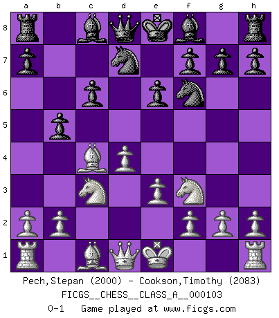 Last move : 0-1 2011 November 14 12:45:22 [Event "FICGS__CHESS__CLASS_A__000103"] [Site "FICGS"] [Date "2011.08.11"] [Round "1"] [White "Pech,Stepan"] [Black "Cookson,Timothy"] [Result "0-1"] [WhiteElo "2000"] [BlackElo "2083"] 1.d4 d5 2.c4 c6 3.Nf3 Nf6 4.Nc3 e6 5.e3 Nbd7 6.Bd3 dxc4 7.Bxc4 b5 0-1 This chess game has been lost on time (started : 2011.08.11 7:23:44) QGD Slav : 4.Nc3 Player Black won this chess game. Follow this game move after move (download)It's always better to sacrifice your opponent's men. (Savielly Tartakover) Es gibt zwei Arten von Opfern: Korrekte und meine. (Mikhail Nekhemyevich Tal) Sin errores no puede haber brillantez. (Emanuel Lasker) Il n'y a plus de joueurs du niveau de Jacob Murray dont la seule quête est le beau jeu, le plaisir de voir les pièces construire quelque chose. Sur 10 idées à la minute, 9 seront sans intérêt, la dernière s'avèrera géniale. (Christian Bauer) Hold em is to stud what chess is to checkers. (Johnny Moss)