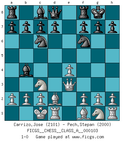 Last move : 1-0 2011 November 23 13:28:48 [Event "FICGS__CHESS__CLASS_A__000103"] [Site "FICGS"] [Date "2011.08.11"] [Round "1"] [White "Carrizo,Jose"] [Black "Pech,Stepan"] [Result "1-0"] [WhiteElo "2101"] [BlackElo "2000"] 1.e4 e5 2.d4 exd4 3.Qxd4 Nc6 4.Qe3 Nf6 5.Nc3 Bb4 6.Bd2 O-O 7.O-O-O 1-0 This chess game has been lost on time (started : 2011.08.11 7:23:44) Centre game : Berger variation Kingside Castling by player Black (move 6) Queenside Castling by player White (move 7) Player White won this chess game. Follow this game move after move (download)Could we look into the head of a Chess player, we should see there a whole world of feelings, images, ideas, emotion and passion. (Alfred Binet) Der zweitbeste Zug ist oft der einzig richtige. (Savielly Grigorievitsch Tartakower) La estratégia requiere pensar, la táctica requiere observación. (Max Euwe) La victoire dans une partie d'Echecs appartient la plupart du temps à celui qui voit un peu plus loin que l'adversaire. (Lasker) Always two there are. No more no less. A master, and an apprentice. (Master Yoda in Star Wars ep.1)