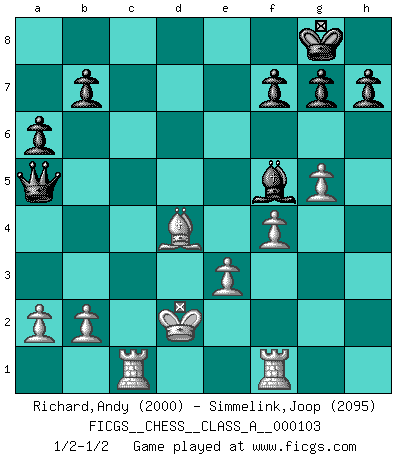 Last move : 1/2-1/2 2011 August 22 11:37:33 [Event "FICGS__CHESS__CLASS_A__000103"] [Site "FICGS"] [Date "2011.08.11"] [Round "1"] [White "Richard,Andy"] [Black "Simmelink,Joop"] [Result "1/2-1/2"] [WhiteElo "2000"] [BlackElo "2095"] 1.d4 d5 2.Nf3 c6 3.c4 Nf6 4.e3 e6 5.Nc3 Nbd7 6.Qc2 Bd6 7.g4 dxc4 8.Bxc4 e5 9.g5 Nd5 10.Bd2 N7b6 11.Bxd5 cxd5 12.dxe5 Bg4 13.exd6 Bxf3 14.Rg1 O-O 15.Qf5 Bh5 16.Nb5 a6 17.Nc7 Qxd6 18.Nxa8 Qxh2 19.Rf1 Rxa8 20.Bc3 Re8 21.Bd4 Qh4 22.Kd2 Nc4+ 23.Kc3 Bg6 24.Qxd5 Rc8 25.Rac1 Qh3 26.Qxc4 Rxc4+ 27.Kxc4 Qf5 28.f4 Qb5+ 29.Kc3 Bf5 30.Kd2 Qa5+ 1/2-1/2 Queen's pawn game Kingside Castling by player Black (move 14) This chess game ended in a draw. Follow this game move after move (download)I look one move ahead... the best ! (Siegbert Tarrasch) Alles was ich jemals tun will ist Schach spielen. (Robert James Fischer) No es tiempo de jugar al Ajedrez cuando la casa esta en llamas. (Proverbio Italiano) L'action d'une oeuvre littéraire se déroule sur un champ de bataille. Les masques et les types du drame moderne correspondent aux pièces du jeu d'échecs. L'intrigue correspond aux coups et aux gambits, c'est à dire aux techniques du jeu telles qu'utilisées et interprétées par les joueurs. Les tactiques et les péripéties [mouvements] correspondent aux coups exécutés par l'adversaire. (Viktor Shklovsky) It's not the will to win, but the will to prepare to win that makes the difference. (Bear Bryant)