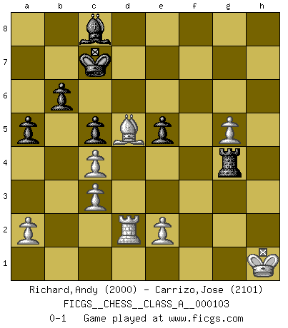 Last move : 0-1 2012 April 23 12:6:22 [Event "FICGS__CHESS__CLASS_A__000103"] [Site "FICGS"] [Date "2011.08.11"] [Round "1"] [White "Richard,Andy"] [Black "Carrizo,Jose"] [Result "0-1"] [WhiteElo "2000"] [BlackElo "2101"] 1.d4 d6 2.Nf3 g6 3.c4 Bg7 4.Nc3 c5 5.dxc5 Bxc3+ 6.bxc3 dxc5 7.Qxd8+ Kxd8 8.g3 Nd7 9.Bg2 Ngf6 10.O-O Ne4 11.Ng5 Nxg5 12.Bxg5 f6 13.Be3 Kc7 14.Rfd1 a5 15.Rd5 Ra6 16.Rad1 Rc6 17.Bf4+ e5 18.Be3 b6 19.h4 Re6 20.R5d2 h6 21.Be4 f5 22.Bd5 Rd6 23.f3 Nf6 24.Bf7 Rc6 25.Kg2 Nh5 26.Bd5 Rd6 27.Bf7 Rf6 28.Bd5 g5 29.Rh1 g4 30.fxg4 f4 31.gxf4 Nxf4+ 32.Bxf4 Rxf4 33.g5 hxg5 34.hxg5 Rxh1 35.Kxh1 Rg4 0-1 Queen's Pawn Kingside Castling by player White (move 10) Player Black won this chess game. Follow this game move after move (download)I give 98 percent of my mental energy to Chess. Others give only 2 percent. (Bobby Fischer) Schach ist Leben. (Robert James Fischer) Bobby solo arroja las piezas y solas caen en las casillas correctas. (Miguel Najdorf ) Mais n'est-ce pas déjà le limiter injurieusement que d'appeler les échecs un jeu? N'est-ce pas aussi une science, un art, ou quelque chose qui, comme le cercueil de Mahomet entre ciel et terre, est suspendu entre l'un et l'autre, et qui réunit un nombre incroyable de contraires ? (Stefan Zweig) After growing wildly for years, the field of computing appears to be reaching its infancy. (John Pierce)