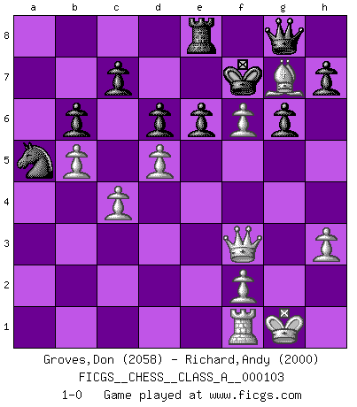 Last move : 1-0 2011 August 29 11:52:1 [Event "FICGS__CHESS__CLASS_A__000103"] [Site "FICGS"] [Date "2011.08.11"] [Round "1"] [White "Groves,Don"] [Black "Richard,Andy"] [Result "1-0"] [WhiteElo "2058"] [BlackElo "2000"] 1.e4 Nf6 2.e5 Nd5 3.d4 d6 4.c4 Nb6 5.Nf3 Bg4 6.exd6 exd6 7.Be2 Be7 8.Nc3 O-O 9.h3 Bh5 10.O-O Nc6 11.b3 Bf6 12.Be3 Re8 13.Qd2 Bg6 14.Bd3 Bxd3 15.Qxd3 a5 16.Rae1 a4 17.Ne4 axb3 18.axb3 Nd7 19.Bd2 g6 20.Nxf6+ Qxf6 21.b4 Qf5 22.Qc3 b6 23.g4 Qf6 24.Bh6 Nf8 25.b5 Na5 26.g5 Qh8 27.Nh2 Re6 28.Ng4 Nd7 29.Qf3 Rae8 30.Rxe6 fxe6 31.Nf6+ Nxf6 32.gxf6 Kf7 33.Bg7 Qg8 34.d5 1-0 Alekhine's defense Kingside Castling by player Black (move 8) Kingside Castling by player White (move 10) Player White won this chess game. Follow this game move after move (download)White lost because he failed to remember the right continuation and had to think up the moves himself. (Siegbert Tarrasch) Es genügt nicht ein guter Spieler zu sein, man muß auch gut spielen. (Siegbert Tarrasch) Buenas posiciones no logran ganar juegos, buenas movidas sí. (Gerald Abrahams) Echiquier : carré parfait, comme la Jérusalem nouvelle décrite par l'auteur de l'Apocalypse, huit cases sur huit, exaltation du chiffre 4, symbole du cosmos aux quatre horizons... où le noir et le blanc, l'ombre et la lumière, le mal et le bien s'entremêlent et se conjuguent. (Robert Couffignal, Le Gambit du poète) 98% of all statistics are made up. (Author unknown)