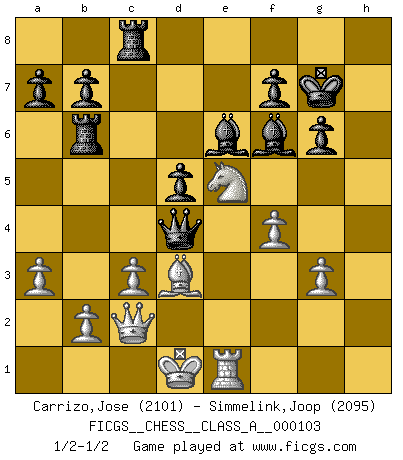 Last move : 1/2-1/2 2012 January 17 1:26:36 [Event "FICGS__CHESS__CLASS_A__000103"] [Site "FICGS"] [Date "2011.08.11"] [Round "1"] [White "Carrizo,Jose"] [Black "Simmelink,Joop"] [Result "1/2-1/2"] [WhiteElo "2101"] [BlackElo "2095"] 1.e4 e5 2.d4 exd4 3.Qxd4 Nc6 4.Qe3 Nf6 5.Nc3 Bb4 6.Bd2 O-O 7.O-O-O Re8 8.Qg3 Rxe4 9.a3 Rg4 10.Qe3 Bf8 11.h3 Rg6 12.Qe1 d5 13.Nf3 d4 14.Be3 Nd5 15.Bxd4 Nxd4 16.Rxd4 c6 17.Bd3 Rd6 18.Nxd5 cxd5 19.Qd2 g6 20.Re1 Be6 21.h4 Rb6 22.h5 Rc8 23.hxg6 hxg6 24.Ne5 Qc7 25.g3 Be7 26.c3 Qc5 27.Kd1 Bf6 28.Qc2 Kg7 29.f4 Qxd4 1/2-1/2 Centre game : Berger variation Kingside Castling by player Black (move 6) Queenside Castling by player White (move 7) This chess game ended in a draw. Follow this game move after move (download)That's what Chess is all about. One day you give your opponent a lesson, the next day he gives you one. (Bobby Fischer) Moralische Siege zählen nicht. (Savielly Grigorievitsch Tartakower) Cuando me preguntan: -¿Cual es el secreto que te hace hacer mejores movidas que tus oponentes?, Yo respondo: Me da gusto que me pregunten eso, porque, como veran, hay una simple razón. Yo pienso mis propias movidas y dejo a mi oponente que el piense las suyas. (Alexander Alekhine) RxDa4 pat (...) Good decisions come from experience, and experience comes from bad decisions. (Anonymous)