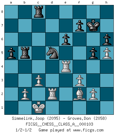 Last move : 1/2-1/2 2011 August 23 10:57:18 [Event "FICGS__CHESS__CLASS_A__000103"] [Site "FICGS"] [Date "2011.08.11"] [Round "1"] [White "Simmelink,Joop"] [Black "Groves,Don"] [Result "1/2-1/2"] [WhiteElo "2095"] [BlackElo "2058"] 1.e4 e6 2.d4 d5 3.Nc3 Nf6 4.Bg5 dxe4 5.Nxe4 Nbd7 6.Nf3 h6 7.Nxf6+ Nxf6 8.Be3 Bd6 9.Bd3 b6 10.Ne5 O-O 11.Qf3 Nd5 12.O-O-O Bb7 13.Bd2 c5 14.Nc4 Rb8 15.Nxd6 Qxd6 16.dxc5 bxc5 17.Qg4 Nf6 18.Qh4 Qd4 19.Qxd4 cxd4 20.Bf4 Rbd8 21.Rhg1 Ne4 22.Rgf1 Nc5 23.Bc4 Rd7 24.Rfe1 Rc8 25.f3 Ba6 26.Bxa6 Nxa6 27.Bg3 Nb4 28.c3 Rb7 29.Rxd4 Nxa2+ 30.Kc2 Nb4+ 31.Kb1 Nd5 32.Kc1 a5 33.R1e4 Rb4 34.Bf2 g5 35.h4 Kg7 36.h5 Rb5 37.Rd2 1/2-1/2 French : Burn variation Kingside Castling by player Black (move 10) Queenside Castling by player White (move 12) This chess game ended in a draw. Follow this game move after move (download)The Chess pieces are the block alphabet which shapes thoughts; and these thoughts, although making a visual design on the chessboard, express their beauty abstractly, like a poem. (Marcel Duchamp) Er war ein guter Schachspieler, aber ich kann Leute nicht ausstehen, die 'Heil Hitler' rufen (Über Alexander Aljechin). (Miguel Najdorf) No soy una persona materialista y por eso, no resiento la falta o pérdida del dinero. La ausencia de cosas mundanas carece de importancia. Ya que el Ajedrez es una forma en la que puedo ser tan materialista como yo desee sin tener la necesidad de vender mi alma. (Jamie Walter Adams) La guerre est enfant de la passion, la passion est enfant du narcissisme et le narcissisme est l'enfant. (...) Une autre partie ? (Thibault de Vassal) True nature is revealed in times of difficulty. (Chinese proverb)