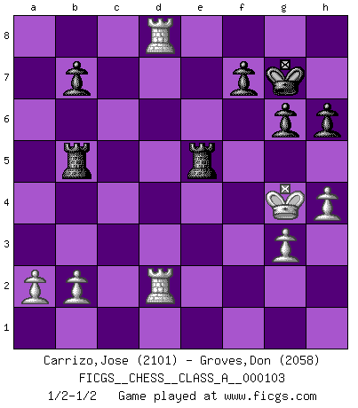 Last move : 1/2-1/2 2012 February 7 7:25:27 [Event "FICGS__CHESS__CLASS_A__000103"] [Site "FICGS"] [Date "2011.08.11"] [Round "1"] [White "Carrizo,Jose"] [Black "Groves,Don"] [Result "1/2-1/2"] [WhiteElo "2101"] [BlackElo "2058"] 1.e4 d6 2.d4 Nf6 3.Nc3 Nbd7 4.f4 e5 5.Nf3 exd4 6.Qxd4 c6 7.Be3 d5 8.exd5 Bc5 9.Qd3 Qe7 10.Nd4 Ng4 11.Nf5 Nde5 12.Nxe7 Nxd3+ 13.Bxd3 Nxe3 14.Nxc8 Rxc8 15.dxc6 Rxc6 16.g3 O-O 17.Ke2 Bd4 18.Rab1 g6 19.Nb5 Bb6 20.Na3 h6 21.Rbe1 Ng2 22.Rc1 Ne3 23.h4 Bc5 24.Nb1 Rb6 25.Nc3 Bd4 26.Nb5 Re8 27.Kf3 Nxc2 28.Rhd1 Re3+ 29.Kg4 a6 30.Rxc2 axb5 31.Bxb5 Be5 32.fxe5 Rxb5 33.Rd7 R3xe5 34.Rd8+ Kg7 35.Rcd2 1/2-1/2 Pirc defense Kingside Castling by player Black (move 16) This chess game ended in a draw. Follow this game move after move (download)In Chess, just as in life, today's bliss may be tomorrow's poison. (Assaic) Es gibt keine einzige Frau, der ich nicht einen Springer vorgeben könnte und trotzdem gewänne. (Robert James Fischer) No volvere nunca a jugar contigo. Has insultado a mi amigo. - cuando un oponente se maldijo por una mala jugada (Miguel Najdorf) Les Echecs ont trois composantes : le temps, l'espace et le matériel en dernier. (Mikhail Tal) Unless I accept my faults I will most certainly doubt my virtues. (Hugh Prather)