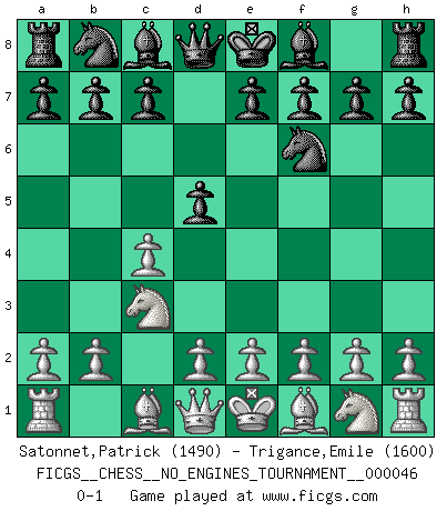 Last move : 0-1 2011 September 28 11:4:41 [Event "FICGS__CHESS__NO_ENGINES_TOURNAMENT__000046"] [Site "FICGS"] [Date "2011.08.11"] [Round "1"] [White "Satonnet,Patrick"] [Black "Trigance,Emile"] [Result "0-1"] [WhiteElo "1490"] [BlackElo "1600"] 1.c4 Nf6 2.Nc3 d5 0-1 This chess game has been lost on time (started : 2011.08.11 13:11:54) English : Anglo-Gruenfeld defense Player Black won this chess game. Follow this game move after move (download)A sacrifice is best refuted by accepting it. (Wilhelm Steinitz) Der Umstand, daß uns eine 7 Stunden Zeitkontrolle ermöglicht eine großartige, tiefe Partie zu spielen, ist für die Massenmedien nicht weiter von Bedeutung. (Alexej Shirov) Prefiero perder una partida realmente buena, que ganar una mala. (David Levy) Dans le domaine de la peinture, de la gravure et de la sculpture, dès la première décennie de notre siècle, les artistes abandonnent la représentation de la partie d'échecs pour se concentrer sur les pièces, sur les échiquiers et sur toutes les variations auxquelles les unes et les autres peuvent donner lieu. On passe en quelque sorte d'un thème social à un thème musical (au sens de la musica médiévale, c'est-à-dire d'une notion qui inclue le rythme, l'harmonie, la construction et la déconstruction, etc.). Graphiquement et picturalement, l'échiquier apparaît comme une structure ouverte, dynamique, d'une richesse infinie, autorisant toutes les combinatoires et débouchant sur des mouvements et des rythmes de nature exponentielle. (Michel Pastoureau) There are 10 types of people in this world: those who understand binary and those who don't. (Anonymous)