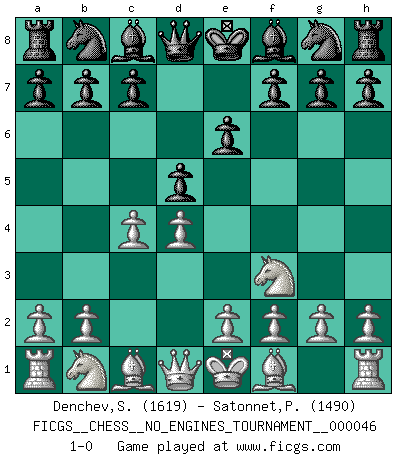 Last move : 1-0 2011 September 29 11:10:55 [Event "FICGS__CHESS__NO_ENGINES_TOURNAMENT__000046"] [Site "FICGS"] [Date "2011.08.11"] [Round "1"] [White "Denchev,Stanimir"] [Black "Satonnet,Patrick"] [Result "1-0"] [WhiteElo "1619"] [BlackElo "1490"] 1.d4 d5 2.Nf3 e6 3.c4 1-0 This chess game has been lost on time (started : 2011.08.11 13:11:54) Queen's pawn game Player White won this chess game. Follow this game move after move (download)On the chessboard, lies and hypocrisy do not survive long. (Emanuel Lasker) Wir können eben der zündenden Macht des Opfers nicht wiederstehen, denn die Begeisterung für das Opfer liegt in der Natur des Menschen. (Rudolf Spielmann) Cualquier cambio de material en una posición debe venir por medio de un mate, una captura o promoción de Peón. (Purdy) À la honte des hommes, on sait que les lois du jeu sont les seules qui soient partout justes, claires, inviolables et exécutées. Pourquoi l'Indien qui a donné les règles du jeu d'échecs est-il obéi de bon gré dans toute la terre, et que les décrétales des papes, par exemple, sont aujourd'hui un objet d'horreur et de mépris ? C'est que l'inventeur des échecs combina tout avec justesse pour la satisfaction des joueurs, et que les papes, dans leurs décrétales, n'eurent en vue que leur seul avantage. L'Indien voulut exercer également l'esprit des hommes et leur donner du plaisir; les papes ont voulu abrutir l'esprit des hommes. Voltaire (Dictionnaire philosophique / Garnier 1967) Drag your thoughts away from your troubles... by the ears, by the heels, or any other way you can manage it. (Mark Twain)
