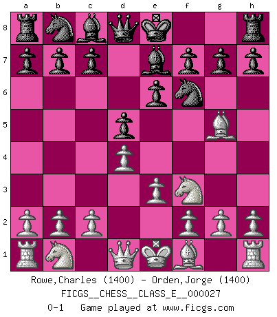 Last move : 0-1 2007 February 15 4:22:42 [Event "FICGS__CHESS__CLASS_E__000027"] [Site "FICGS"] [Date "2006.12.31"] [Round "1"] [White "Rowe,Charles"] [Black "Orden,Jorge"] [Result "0-1"] [WhiteElo "1400"] [BlackElo "1400"] 1.d4 d5 2.Nf3 Nf6 3.Bg5 e6 4.e3 Be7 0-1 This chess game has been lost on time (started : 2006.12.31 7:58:24) Torre attack (Tartakower variation) Player Black won this chess game. Follow this game move after move (download)I am the best player in the world and I am here to prove it. (Bobby Fischer) Obendrein hat der FIDE-Präsident den Revolutionsführer Gaddafi zum »Großmeister« ernannt, am Ende der WM. Das ist lächerlich! (Joel Lautier) Tu no necesitas jugar muy bien, únicamente ayudar a tu oponenet a que juegue muy mal. (Genrikh Chepukaitis) Les réformistes prétendent que les progrès de la théorie conduiront à la disparition des échecs, et qu'il faut, pour leur rendre vie, en remanier les règles. En réalité, qu'exprime cette affirmation? Le mépris de l'intuition, de l'imagination et de tous les autres éléments qui font des échecs un art. (Alexander Alekhine) Luck has a peculiar habit of favoring those who don't depend on it. (Author unknown)
