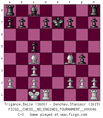 Last move : 1-0 2011 September 8 9:28:35 [Event "FICGS__CHESS__NO_ENGINES_TOURNAMENT__000046"] [Site "FICGS"] [Date "2011.08.11"] [Round "1"] [White "Trigance,Emile"] [Black "Denchev,Stanimir"] [Result "1-0"] [WhiteElo "1600"] [BlackElo "1619"] 1.e4 e5 2.Nf3 Nc6 3.Bc4 Be7 4.d4 exd4 5.Nxd4 Nxd4 6.Qxd4 Nf6 7.e5 c5 8.Qf4 g5 9.Qf3 g4 10.Qf4 Qc7 11.exf6 Qxf4 12.Bxf4 Bxf6 13.Nc3 Bxc3+ 14.bxc3 Ke7 15.O-O-O 1-0 Hungarian defense Queenside Castling by player White (move 15) Player White won this chess game. Follow this game move after move (download)I like the moment when I break a man's ego. (Bobby Fischer) Ich habe Putins Aufstieg an die Macht beobachtet und seine Politik, die demokratischen Institutionen meines Landes zu zerstören. (Garry Kasparov) El Ajedrez expande y enriquece tu mente. (Saudin Robovic) La vie est comme un jeu d'échecs : nous esquissons un plan, mais celui-ci est tributaire de ce que daignent faire l'adversaire aux échecs et le destin dans la vie. (Arthur Schopenhauer) I don't know, I don't care, and it doesn't make any difference. (Albert Einstein)