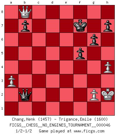Last move : 1/2-1/2 2011 December 27 16:39:22 [Event "FICGS__CHESS__NO_ENGINES_TOURNAMENT__000046"] [Site "FICGS"] [Date "2011.08.11"] [Round "1"] [White "Chang,Henk"] [Black "Trigance,Emile"] [Result "1/2-1/2"] [WhiteElo "1457"] [BlackElo "1600"] 1.d4 Nf6 2.Nf3 d5 3.e3 e6 4.Bd3 c5 5.c4 Nbd7 6.O-O Be7 7.Nc3 dxc4 8.Bxc4 Nb6 9.Bb3 O-O 10.dxc5 Bxc5 11.Ng5 Qc7 12.Qf3 Bd7 13.Nge4 Be7 14.Bd2 Bc6 15.Nxf6+ Bxf6 16.Qe2 Rad8 17.Rac1 Qb8 18.f3 Rd6 19.e4 Bd4+ 20.Be3 Bxe3+ 21.Qxe3 Rfd8 22.Ne2 Rd2 23.Rfd1 Rxd1+ 24.Rxd1 Rxd1+ 25.Bxd1 e5 26.Bb3 Qd6 27.Nc3 Kf8 28.h3 f6 29.h4 Ke7 30.Nd5+ Nxd5 31.exd5 Bxd5 32.Bxd5 Qxd5 33.Qxa7 e4 34.Qe3 f5 35.Qg5+ Kf7 36.fxe4 Qd4+ 37.Kh2 Qxe4 38.Qh5+ Kg8 39.a3 g6 40.Qg5 Qe5+ 41.Qg3 Qxb2 42.Qb8+ Kf7 1/2-1/2 Queen's pawn game Kingside Castling by player White (move 6) Kingside Castling by player Black (move 9) This chess game ended in a draw. Follow this game move after move (download)All I want to do, ever, is just play Chess. (Bobby Fischer) Capablanka war das größte Genie der Schachgeschichte! Aber denken sie nicht er habe nichts vom Schach verstanden. Er wusste nur soviel wie er wissen musste um seine Ziele zu erreichen. (Mikhail Moiseyevich Botvinik) ¿Cual es el objetivo de jugar una apertura de gambito?... Para adquirir una reputación de ser un jugador apuesto a costo de perder el juego. (Siegbert Tarrasch) Aidez vos pièces, elles vous aideront. (Paul Morphy) Somewhere in the world there is an epigram for every dilemma. (Hendrik Willem van Loon)
