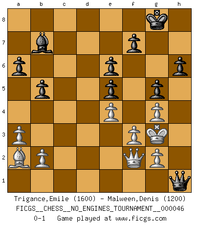 Last move : 0-1 2011 October 1 16:36:18 [Event "FICGS__CHESS__NO_ENGINES_TOURNAMENT__000046"] [Site "FICGS"] [Date "2011.08.11"] [Round "1"] [White "Trigance,Emile"] [Black "Malween,Denis"] [Result "0-1"] [WhiteElo "1600"] [BlackElo "1200"] 1.e4 c5 2.d4 cxd4 3.c3 dxc3 4.Nxc3 d6 5.Nf3 Nf6 6.Bc4 e6 7.O-O Nc6 8.Qe2 a6 9.Rd1 Qc7 10.Bf4 Be7 11.Rd2 O-O 12.a3 Rd8 13.Rad1 b6 14.Rd3 h6 15.h3 Bb7 16.Nh2 Ne5 17.Bxe5 dxe5 18.Ba2 Qc6 19.Rxd8+ Rxd8 20.Rxd8+ Bxd8 21.f3 b5 22.Ng4 Nxg4 23.hxg4 Bb6+ 24.Kh2 Qc5 25.Kg3 Qg1 26.Nd1 g5 27.Nf2 Bxf2+ 28.Qxf2 Qh1 0-1 Sicilian : Smith-Morra gambit Kingside Castling by player White (move 7) Kingside Castling by player Black (move 11) Player Black won this chess game. Follow this game move after move (download)The passed Pawn is a criminal, who should be kept under lock and key. Mild measures, such as police surveillance, are not sufficient. (Aaron Nimzovich) Kleine Schachspieler machen Mist, und große Schachspieler machen Mist, aber große machen weniger Mist. (Fritz Sämisch) Nada excita más a Grandes Maestros aburridos que una novedad teórica. (Dominic Lawson) Le jeu d'échecs est comme rejeté hors du temps. (Antoine de Saint-Exupéry) If you lose the game you should win the analysis! (Proverb)