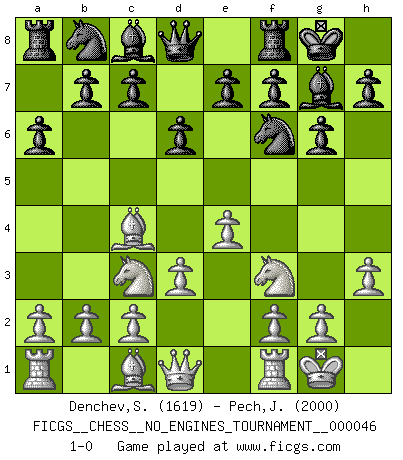 Last move : 1-0 2011 November 12 20:12:11 [Event "FICGS__CHESS__NO_ENGINES_TOURNAMENT__000046"] [Site "FICGS"] [Date "2011.08.11"] [Round "1"] [White "Denchev,Stanimir"] [Black "Pech,Jaroslav senior"] [Result "1-0"] [WhiteElo "1619"] [BlackElo "2000"] 1.e4 d6 2.Nf3 Nf6 3.Nc3 g6 4.Bc4 Bg7 5.d3 O-O 6.O-O a6 7.h3 1-0 This chess game has been lost on time (started : 2011.08.11 13:11:54) King's pawn Opening Kingside Castling by player Black (move 5) Kingside Castling by player White (move 6) Player White won this chess game. Follow this game move after move (download)You cannot play at Chess if you are kind-hearted. (French Proverb) Ein Springer auf f6 gegen die eigene Rochadestellung ist schlimmer als ein rostiger Nagel im Knie. (Efim Bogoljubov) Si el ingenio solamente fuese necesario para lucirse, las mujeres serían las mejores jugadoras de Ajedrez del mundo. (Albin) Vous m'avez demandé de vous exposer quel est le fondement de la prière. Je ne fais que préparer les pièces du jeu sur la table... Nous sera-t-il permis d'en adopter les règles et si nous les appliquons scrupuleusement nous ne tarderons pas à faire mat le Roi divin ! Il ne pourra échapper à nos mains. (Sainte Thérèse d'Avila, Chemin de perfection) Do not put your faith in what statistics say until you have carefully considered what they do not say. (William W. Watt)
