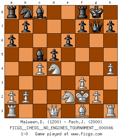 Last move : 1-0 2011 December 28 17:20:55 [Event "FICGS__CHESS__NO_ENGINES_TOURNAMENT__000046"] [Site "FICGS"] [Date "2011.08.11"] [Round "1"] [White "Malween,Denis"] [Black "Pech,Jaroslav senior"] [Result "1-0"] [WhiteElo "1200"] [BlackElo "2000"] 1.e4 c5 2.Nf3 e6 3.d4 cxd4 4.Nxd4 a6 5.c4 Nf6 6.Nc3 Bb4 7.f3 O-O 8.Bg5 d5 9.e5 Qc7 10.exf6 Qe5+ 11.Kf2 Qxg5 12.fxg7 Qxg7 13.h4 Bc5 14.Nce2 1-0 This chess game has been lost on time (started : 2011.08.11 13:11:54) Sicilian : Kan, Maroczy bind (Reti variation) Kingside Castling by player Black (move 7) Player White won this chess game. Follow this game move after move (download)Bobby Fischer's current state of mind is indeed a tragedy. One of the world's greatest Chess players - the pride and sorrow of American Chess. (Frank Brady) Strategie ist, wie man ein Mädchen auf den Rücksitz bekommt. Taktik ist, was man tut, wenn man dann dort ist. (Anonymous) Una buena memoria, concentración, imaginación y una fuerte voluntad, se requiere para llegar a ser un buen jugador. (Bobby Fischer) Les ravages du H expliquent la différence de niveau entre Tal et Thal [Abergel]. He who fights with monsters should be careful lest he thereby become a monster. (Friedrich Nietzsche, Beyond Good and Evil)