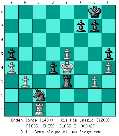 Last move : 0-1 2007 March 1 23:45:31 [Event "FICGS__CHESS__CLASS_E__000027"] [Site "FICGS"] [Date "2006.12.31"] [Round "1"] [White "Orden,Jorge"] [Black "Kis-Kos,Laszlo"] [Result "0-1"] [WhiteElo "1400"] [BlackElo "1200"] 1.e4 e5 2.Nc3 Nf6 3.Nf3 Nc6 4.Bb5 Bb4 5.d3 d6 6.Bd2 O-O 7.O-O Ne7 8.h3 c6 9.Ba4 b5 10.Nxb5 cxb5 11.Bxb4 bxa4 12.c4 Qd7 13.c5 Nc6 14.Qxa4 Nxb4 15.Qxb4 dxc5 16.Qc4 Bb7 17.Nxe5 Qd4 18.Qxd4 cxd4 19.f4 Rfc8 20.Nf3 Rc2 21.e5 Bxf3 22.Rxf3 Nd5 23.b3 Rac8 24.Rf2 Rxf2 25.Kxf2 Nxf4 26.Kf3 Nxd3 27.Ke4 Nb4 28.a3 Nc2 29.Rc1 Rc3 30.a4 a5 31.h4 h5 32.g3 Re3+ 0-1 Vienna : Falkbeer variation Kingside Castling by player Black (move 6) Kingside Castling by player White (move 7) Player Black won this chess game. Follow this game move after move (download)What is the object of playing a gambit opening?... To acquire a reputation of being a dashing player at the cost of losing a game. (Siegbert Tarrasch) Stil? Ich habe keinen Stil! (Anatoly Karpov) El Ajedrez es parte de una cultura y si una cultura esta en decadencia, entonces también el Ajedrez declinará. (Mikhail Botvinnik) Dieu déplace le joueur, et celui-ci la pièce. Quel Dieu derrière Dieu commence donc la trame ? Arturo Perez-Reverte (prix de littérature policière 1993). The intuitive mind is a sacred gift; the rational mind is a faithful servant. We have created a society that honors the servant but has forgotten the gift. (Albert Einstein)