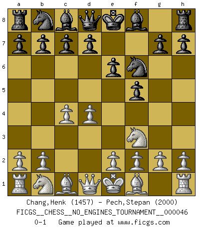 Last move : 0-1 2011 November 19 13:1:25 [Event "FICGS__CHESS__NO_ENGINES_TOURNAMENT__000046"] [Site "FICGS"] [Date "2011.08.11"] [Round "1"] [White "Chang,Henk"] [Black "Pech,Stepan"] [Result "0-1"] [WhiteElo "1457"] [BlackElo "2000"] 1.d4 f5 2.Nf3 Nf6 3.c4 e6 0-1 This chess game has been lost on time (started : 2011.08.11 13:11:54) Dutch Player Black won this chess game. Follow this game move after move (download)The Pin is mightier than the sword. (Fred Reinfeld) Versuche, dich von der Sklaverei der Eröffnungsvarianten zu befreien. Stattdessen soll man gewisse Typenpositionen erlernen, die man eingehend analysiert. (Aaron Nimzowitsch) Tu puedes aprender mucho mas de una partida que pierdas que de una partida ganada. Tendras que perder cientos de partidas antes de llegar a ser un buen jugador. (Jose Raul Capablanca) Assurément je connaissais par expérience le mystérieux attrait de ce jeu royal, le seul entre tous les jeux inventés par les hommes qui échappe souverainement à la tyrannie du hasard, le seul où l'on ne doive sa victoire qu'à son intelligence ou plutôt à une certaine forme d'intelligence. Mais n'est-ce pas déjà le limiter injurieusement que d'appeler les échecs un jeu ? N'est-ce pas une science, un art ou quelque chose qui, comme le cercueil de Mahomet entre ciel et terre, est suspendu entre l'un et l'autre, et qui réunit un nombre incroyable de contraires ? [...] C'est une pensée qui ne mène à rien, une mathématique qui n'établit rien, un art qui ne laisse pas d'uvre, une architecture sans matière; et il l'a prouvé néanmoins qu'il était plus durable, à sa manière, que les livres ou que tout autre monument, ce jeu unique qui appartient à tous les peuples et à tous les temps, et dont personne ne sait quel dieu en fit don à la terre pour tuer l'ennui, pour aiguiser l'esprit et stimuler l'âme. Où commence-t-il, où finit-il ? (Stefan Zweig) Men should grow up. - Yeah. And dogs should stop licking themselves. It's not gonna happen. (Gregory House to Dr. Cameron, House M.D.)