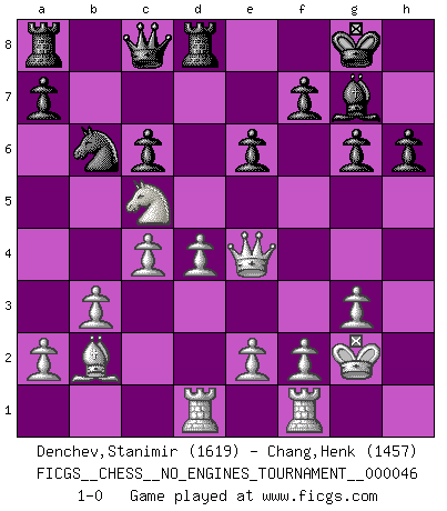 Last move : 1-0 2011 November 29 2:31:25 [Event "FICGS__CHESS__NO_ENGINES_TOURNAMENT__000046"] [Site "FICGS"] [Date "2011.08.11"] [Round "1"] [White "Denchev,Stanimir"] [Black "Chang,Henk"] [Result "1-0"] [WhiteElo "1619"] [BlackElo "1457"] 1.d4 Nf6 2.Nf3 g6 3.g3 Bg7 4.Bg2 O-O 5.O-O d5 6.c4 c6 7.Nbd2 Bg4 8.b3 Ne4 9.Bb2 Nd7 10.Nxe4 dxe4 11.Ng5 h6 12.Nxe4 Nb6 13.h3 Be6 14.Nc5 Bf5 15.Nxb7 Qc8 16.Nc5 Bxh3 17.Qd3 Bxg2 18.Kxg2 Rd8 19.Qe4 e6 20.Rad1 1-0 This chess game has been lost on time (started : 2011.08.11 13:11:54) King's Indian : Fianchetto without c4 Kingside Castling by player Black (move 4) Kingside Castling by player White (move 5) Player White won this chess game. Follow this game move after move (download)Nowadays, when you're not a grandmaster at 14, you can forget about it. (Anand Viswanathan) Es war undenkbar für die Behörden, dass ein sowjetischer Großmeister auf diese Art und Weise [Fischer-Taimanov 6:0] verliert, ohne dass es eine politischer Erklärung dafür gäbe. (Mark Taimanov) Cualquier cambio de material en una posición debe venir por medio de un mate, una captura o promoción de Peón. (Purdy) Lorsque vous vous retrouvez devant une position atroce, ne tendez pas un ultime piège dérisoire avec l'intention d'abandonner si l'adversaire le déjoue ! Faites-vous plutôt un devoir de résister comme si votre vie en dépendait. Jouez le coup qui vous déplairait au centuple si vous étiez dans la peau de votre tortionnaire ! Wipe them out. All of them. (Darth Sidious in Star Wars ep.1)