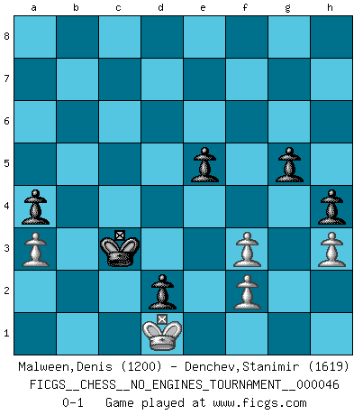 Last move : 0-1 2011 November 28 16:58:12 [Event "FICGS__CHESS__NO_ENGINES_TOURNAMENT__000046"] [Site "FICGS"] [Date "2011.08.11"] [Round "1"] [White "Malween,Denis"] [Black "Denchev,Stanimir"] [Result "0-1"] [WhiteElo "1200"] [BlackElo "1619"] 1.e4 c5 2.Nf3 e6 3.d4 Nf6 4.Nc3 d5 5.Bg5 Be7 6.e5 Nfd7 7.Bxe7 Kxe7 8.Ne2 Nc6 9.c3 h6 10.Ng3 Qa5 11.Qd2 cxd4 12.cxd4 Qxd2+ 13.Kxd2 f6 14.Bb5 fxe5 15.dxe5 Ndxe5 16.Bxc6 Nxf3+ 17.gxf3 bxc6 18.Rac1 Kd6 19.Rc2 Ba6 20.Rhc1 Rac8 21.b4 Bc4 22.Ke3 c5 23.Rd1 cxb4 24.Rdc1 Ba6 25.Nh5 g6 26.Nf4 g5 27.Nd3 Rxc2 28.Rxc2 Rc8 29.Rxc8 Bxc8 30.Nxb4 e5 31.Kd3 a5 32.Nc2 Bf5+ 33.Kd2 Bxc2 34.Kxc2 Kc5 35.Kc3 a4 36.a3 d4+ 37.Kd3 Kd5 38.h3 h5 39.Kd2 Kc4 40.Kc2 d3+ 41.Kd2 Kd4 42.Kd1 Kc3 43.Kc1 d2+ 44.Kd1 h4 0-1 Sicilian defense Player Black won this chess game. Follow this game move after move (download)The Pawns are the soul of the game. (Francois Andre Danican Philidor) Ich rechne überhaupt nicht voraus. Ich gewinne auch so. (Robert James Fischer) El Ajedrez es un terrible juego. Si no controlas el centro, tu oponente tiene una posición mas holgada. Si tienes control del centro, ¡entonces realmente tu tienes algo de que preocuparte!. (Siegbert Tarrasch) L'ordinateur a tué l'originalité. Il n'y a plus guère d'aventures sur l'échiquier. (Jacob Murray) There is no instance of a country having benefited from prolonged warfare. (Sun Tzu)