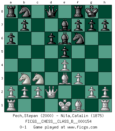 Last move : 0-1 2011 November 15 0:45:12 [Event "FICGS__CHESS__CLASS_B__000154"] [Site "FICGS"] [Date "2011.08.11"] [Round "1"] [White "Pech,Stepan"] [Black "Nita,Catalin"] [Result "0-1"] [WhiteElo "2000"] [BlackElo "1875"] 1.e4 c5 2.Nf3 d6 3.d4 cxd4 4.Nxd4 Nf6 5.Nc3 a6 6.Be3 e5 7.Nb3 Be6 8.f3 Be7 9.Qd2 O-O 0-1 This chess game has been lost on time (started : 2011.08.11 15:9:37) Sicilian : Najdorf, Byrne (English) attack Kingside Castling by player Black (move 9) Player Black won this chess game. Follow this game move after move (download)Chess books should be used as we use glasses: to assist the sight, although some players make use of them as if they thought they conferred sight. (Jose Raul Capablanca) Wie bekannt hörte Morphy 1859 auf, Schach zu spielen. Seine Enttäuschung galt nicht so sehr dem Schach, wie den Schachspielern. (Robert James Fischer) Debemos de asegurarnos de que el Ajedrez no se convierta en un lenguaje muerto, muy interesante, pero tan solo para un grupo muy pequeño. (Sytze Faber) Vouloir jouer aux échecs contre soi-même est aussi paradoxal que vouloir marcher sur son ombre. (Stefan Zweig) Who needs drugs and alcohol if he can play Big Chess at FICGS ? (Heinz-Georg Lehnhoff)