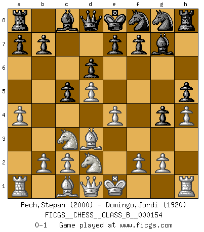 Last move : 0-1 2011 November 5 13:50:9 [Event "FICGS__CHESS__CLASS_B__000154"] [Site "FICGS"] [Date "2011.08.11"] [Round "1"] [White "Pech,Stepan"] [Black "Domingo,Jordi"] [Result "0-1"] [WhiteElo "2000"] [BlackElo "1920"] 1.e4 h6 2.d4 c5 3.d5 d6 4.Nc3 g5 5.Nf3 Bg7 6.Bd3 Nd7 7.a4 Nf8 8.h4 g4 9.Nd2 h5 0-1 Carr's defense Player Black won this chess game. Follow this game move after move (download)A Chess game is a dialogue, a conversation between a player and his opponent. Each move by the opponent may contain threats or be a blunder, but a player cannot defend against threats or take advantage of blunders if he does not first ask himself: What is my opponent planning after each move ? (Bruce A. Moon) Ich bin der einzige Schachspieler, der sich während der Vorbereitungen zum Turnier verletzt hat. (Woody Allen) Cuando veas una buena jugada, trata de encontrar otra mejor. (Emanuel Lasker) Comme les marins qui ont mille raisons différentes d'aller en mer, les joueurs d'échecs en ont tout autant avant de s'installer devant une table et jouer... (Vincent Bertignac, philosophe) He is a liar. I just don't know what the lie is yet. (Horatio Caine, C.S.I. Miami)