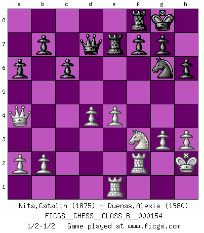Last move : 1/2-1/2 2011 September 21 19:56:16 [Event "FICGS__CHESS__CLASS_B__000154"] [Site "FICGS"] [Date "2011.08.11"] [Round "1"] [White "Nita,Catalin"] [Black "Duenas,Alexis"] [Result "1/2-1/2"] [WhiteElo "1875"] [BlackElo "1980"] 1.e4 e5 2.Nf3 Nc6 3.d4 exd4 4.Nxd4 Bc5 5.Be3 Qf6 6.c3 Nge7 7.Bc4 Ne5 8.Be2 Qg6 9.O-O d6 10.f3 O-O 11.Nd2 d5 12.Kh1 dxe4 13.fxe4 Bg4 14.Bf4 Bxe2 15.Qxe2 Bd6 16.Bxe5 Bxe5 17.N2f3 Bxd4 18.cxd4 c6 19.Rae1 Qg4 20.Qc4 Ng6 21.h3 Qd7 22.Rf2 Rae8 23.Qa4 a6 24.Kh2 Re7 25.g3 h6 1/2-1/2 Scotch game Kingside Castling by player White (move 9) Kingside Castling by player Black (move 10) This chess game ended in a draw. Follow this game move after move (download)A passed Pawn increases in strength as the number of pieces on the board diminishes. (Capablanca) Jeder Schachmeister war einmal ein Anfänger. (Irving Chernev) Todos los Maestros de Ajedrez fueron un día unos principiantes. (Chernev) Aucun coup ne doit être joué sans but. (Pedro Damiano) A good programmer is someone who always looks both ways before crossing a one-way street. (Doug Linder)