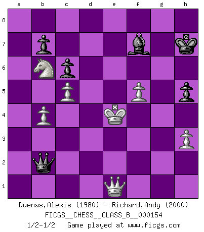 Last move : 1/2-1/2 2011 September 1 22:55:28 [Event "FICGS__CHESS__CLASS_B__000154"] [Site "FICGS"] [Date "2011.08.11"] [Round "1"] [White "Duenas,Alexis"] [Black "Richard,Andy"] [Result "1/2-1/2"] [WhiteElo "1980"] [BlackElo "2000"] 1.d4 d5 2.c4 c6 3.e3 Nf6 4.Nc3 a6 5.Nf3 e6 6.c5 Nbd7 7.b4 g6 8.Bd3 Bg7 9.O-O O-O 10.Na4 Re8 11.h3 e5 12.Nxe5 Nxe5 13.dxe5 Rxe5 14.Bb2 Rg5 15.f4 Rg3 16.Rf3 Rxf3 17.Qxf3 Nd7 18.Bxg7 Kxg7 19.Qf2 Qe7 20.Re1 a5 21.Bc2 f5 22.a3 axb4 23.axb4 Ra7 24.Qd2 Nb8 25.Nb6 Be6 26.e4 fxe4 27.Bxe4 Qf6 28.Bb1 Ra1 29.g4 Qh4 30.Qc3+ Qf6 31.Qe3 d4 32.Qd2 d3 33.Qe3 Bf7 34.f5 gxf5 35.gxf5 Kh8 36.Bxd3 Na6 37.Bxa6 Rxa6 38.Qe5 Kg7 39.Qf4 Kh8 40.Re2 Ra2 41.Rg2 Rxg2+ 42.Kxg2 h6 43.Kf3 Qc3+ 44.Qe3 Qf6 45.Ke4 Kh7 46.Qg3 Qb2 47.Qg1 h5 48.Qe1 Qf6 49.Qg3 Qb2 50.Qe1 Qf6 51.Qg3 Qb2 52.Qe1 1/2-1/2 QGD Slav defense Kingside Castling by player White (move 9) Kingside Castling by player Black (move 9) This chess game ended in a draw. Follow this game move after move (download)Chess is mental torture. (Garry Kasparov) Das Blackmar-Diemer-Gambit verändert den ganzen Menschen! (Emil Joseph Diemer) A la fecha, Fischer esta simplemente un nivel arriba de todos los mejores jugadores de Ajedrez del mundo. (John Jacobs) Aux échecs, les retours au sommet sont rares : les dommages psychologiques consécutifs à une défaite sont trop sévères. (Daily Telegraph) Cactus - It is depressed cucumber. (Ilmars Cirulis)