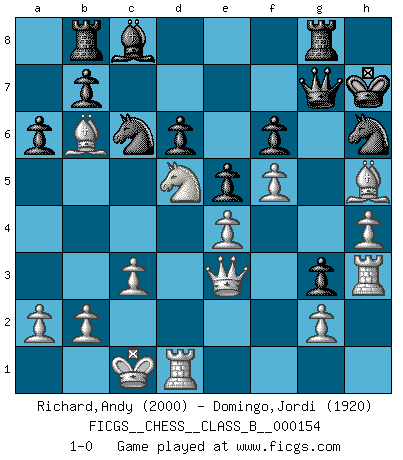 Last move : 1-0 2011 November 5 21:15:54 [Event "FICGS__CHESS__CLASS_B__000154"] [Site "FICGS"] [Date "2011.08.11"] [Round "1"] [White "Richard,Andy"] [Black "Domingo,Jordi"] [Result "1-0"] [WhiteElo "2000"] [BlackElo "1920"] 1.d4 h6 2.e4 c5 3.Nf3 g5 4.dxc5 Bg7 5.h4 g4 6.Nd4 Qa5+ 7.c3 Qxc5 8.Be3 Nc6 9.Nf5 Qe5 10.Nd2 h5 11.Nc4 Qf6 12.Qa4 Nh6 13.Nxg7+ Qxg7 14.O-O-O f6 15.Nb6 Rb8 16.Nd5 a6 17.Bb6 g3 18.f3 e6 19.Nc7+ Kf7 20.Qa3 Kg6 21.Qc5 Nf7 22.f4 Rg8 23.Rh3 Kh6 24.Be2 e5 25.f5 Kh7 26.Nd5 d6 27.Qe3 Nh6 28.Bxh5 1-0 Queen's pawn Queenside Castling by player White (move 14) Player White won this chess game. Follow this game move after move (download)In the perfect Chess combination as in a first-rate short story, the whole plot and counter-plot should lead up to a striking finale, the interest not being allayed until the very last moment. (Yates and Winter) Der Schachmeister von Heute braucht Courage, einen Killerinstinkt, Ausdauer und Arroganz. (Larry Evans) Las ideas audaces son como las piezas del Ajedrez que avanzan hacia adelante. Ellas pueden ser vencidas, pero también pueden iniciar una partida victoriosa. (Goethe) RxDa4 pat (...) Without enthusiasm, virtue functions not at all, and vice only poorly. (Mignon McLaughlin, The Neurotic's Notebook, 1960)