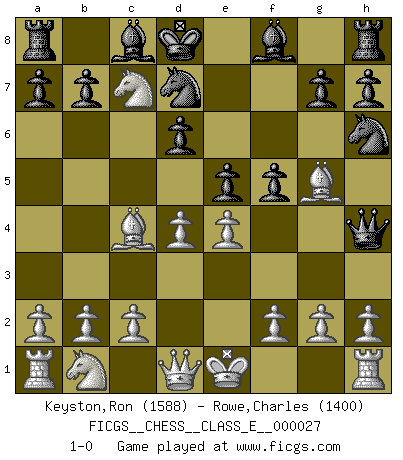 Last move : 1-0 2007 February 10 3:38:7 [Event "FICGS__CHESS__CLASS_E__000027"] [Site "FICGS"] [Date "2006.12.31"] [Round "1"] [White "Keyston,Ron"] [Black "Rowe,Charles"] [Result "1-0"] [WhiteElo "1588"] [BlackElo "1400"] 1.e4 e5 2.Nf3 d6 3.d4 Nd7 4.Bc4 f5 5.Ng5 Nh6 6.Ne6 Qh4 7.Nxc7+ Kd8 8.Bg5+ 1-0 This chess game has been lost on time (started : 2006.12.31 7:58:24) Philidor : Hanham variation Player White won this chess game. Follow this game move after move (download)Different people feel differently about resigning. (Bobby Fischer) Ich habe die Schachforschung dermaßen betrieben, dass sie auf eine wissenschaftliche Basis gestellt wurde. (Mikhail Moiseyevich Botvinik) Cuando me preguntan: -¿Cual es el secreto que te hace hacer mejores movidas que tus oponentes?, Yo respondo: Me da gusto que me pregunten eso, porque, como veran, hay una simple razón. Yo pienso mis propias movidas y dejo a mi oponente que el piense las suyas. (Alexander Alekhine) La solitude du joueur d'Echecs à l'approche du mat est semblable à celle du condamné. (Francis Szpiner) Life is pain my dear and anyone who says otherwise is selling something. (Princess Bride)