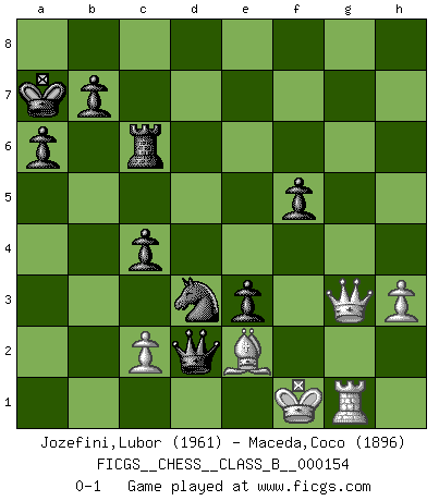 Last move : 0-1 2012 September 7 8:21:38 [Event "FICGS__CHESS__CLASS_B__000154"] [Site "FICGS"] [Date "2011.08.11"] [Round "1"] [White "Jozefini,Lubor"] [Black "Maceda,Coco"] [Result "0-1"] [WhiteElo "1961"] [BlackElo "1896"] 1.e4 c5 2.Nf3 d6 3.Nc3 Nf6 4.e5 dxe5 5.Nxe5 a6 6.a4 Qc7 7.d4 e6 8.Be3 Nbd7 9.Nc4 Nb6 10.Qd3 Nbd5 11.Be2 Nxe3 12.fxe3 Bd7 13.O-O Bc6 14.Rad1 O-O-O 15.Ne5 Be8 16.Qc4 Bd6 17.Bf3 Kb8 18.b3 Rc8 19.h3 h5 20.Ne2 Bxe5 21.dxe5 Nd7 22.Qc3 Nxe5 23.Nf4 c4 24.Be2 g5 25.Nxh5 f5 26.Ng3 Bc6 27.b4 Bxa4 28.Nh5 Bc6 29.Kf2 Rh6 30.Rd4 Rf8 31.Rfd1 g4 32.Nf4 gxh3 33.gxh3 Nf7 34.Qa3 Qe7 35.Rg1 e5 36.Nd5 Qd8 37.b5 exd4 38.bxc6 dxe3+ 39.Ke1 Rxc6 40.Qe7 Qxd5 41.Qxf8+ Ka7 42.Qg7 Ne5 43.Qg3 Qd2+ 44.Kf1 Nd3 0-1 Sicilian Kingside Castling by player White (move 13) Queenside Castling by player Black (move 14) Player Black won this chess game. Follow this game move after move (download)Bobby Fischer is the greatest Chess player who has ever lived. (Ken Smith) Ich würde mich als ganz normalen Jungen bezeichnen [Im Alter von 12]. (Sergej Karjakin) Para mi, el Ajedrez es la vida y cada partida es como una nueva vida. Todo jugador de Ajedrez suele vivir muchas vidas durante su vida. (Eduard Gufeld) Les Echecs ont trois composantes : le temps, l'espace et le matériel en dernier. (Mikhail Tal) Go and wake up your luck. (Persian saying)
