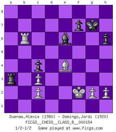Last move : 1/2-1/2 2011 September 2 19:18:40 [Event "FICGS__CHESS__CLASS_B__000154"] [Site "FICGS"] [Date "2011.08.11"] [Round "1"] [White "Duenas,Alexis"] [Black "Domingo,Jordi"] [Result "1/2-1/2"] [WhiteElo "1980"] [BlackElo "1920"] 1.d4 h6 2.e4 c5 3.d5 d6 4.Nf3 g5 5.Bd3 Bg7 6.O-O Nd7 7.a4 Nf8 8.Nc3 Ng6 9.Qe2 Nf6 10.e5 Nxe5 11.Nxe5 dxe5 12.Re1 O-O 13.Qxe5 Re8 14.Bd2 Qd6 15.Nb5 Qxe5 16.Rxe5 Rd8 17.Nc7 Ne8 18.Rxe7 Nxc7 19.Rxc7 Rxd5 20.Bc3 Bxc3 21.bxc3 Re5 22.a5 Kf8 23.f4 gxf4 24.Rf1 b6 25.Rxf4 Re7 26.axb6 axb6 27.Rc6 Re6 28.Rf6 Kg7 29.Rfxe6 Bxe6 30.Rxb6 c4 31.Be4 Ra3 32.Kf2 1/2-1/2 Queen's pawn Kingside Castling by player White (move 6) Kingside Castling by player Black (move 12) This chess game ended in a draw. Follow this game move after move (download)Checkers is for tramps. (Paul Morphy) Capablanka war das größte Genie der Schachgeschichte! Aber denken sie nicht er habe nichts vom Schach verstanden. Er wusste nur soviel wie er wissen musste um seine Ziele zu erreichen. (Mikhail Moiseyevich Botvinik) Del Ajedrez se ha dicho que la vida no es lo suficientemente larga para él, pero eso es culpa de la vida, no del Ajedrez. (William Ewart Napier) Un footballeur joue avec ses pieds, parfois avec sa tête. Un joueur d'échecs ne joue qu'avec sa tête. Et quand il ne joue plus, il meurt. (Jacob Murray) In every real man a child is hidden that wants to play. (Friedrich Nietzsche)