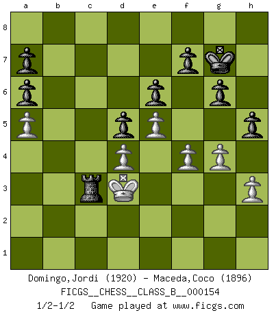 Last move : 1/2-1/2 2012 March 26 19:20:8 [Event "FICGS__CHESS__CLASS_B__000154"] [Site "FICGS"] [Date "2011.08.11"] [Round "1"] [White "Domingo,Jordi"] [Black "Maceda,Coco"] [Result "1/2-1/2"] [WhiteElo "1920"] [BlackElo "1896"] 1.e4 c5 2.Nf3 d6 3.c3 Nf6 4.Be2 g6 5.O-O Bg7 6.Bb5+ Bd7 7.Bxd7+ Nbxd7 8.Re1 O-O 9.d4 Qb6 10.Qe2 e6 11.a4 Rfc8 12.Bf4 d5 13.a5 Qa6 14.Qxa6 bxa6 15.e5 Ne4 16.Nbd2 Nxd2 17.Bxd2 Rab8 18.Ra2 cxd4 19.cxd4 Bf8 20.Kf1 Bb4 21.Ke2 Rc7 22.Kd3 Bxd2 23.Kxd2 Rbc8 24.Ke3 Nb8 25.Rb1 Nc6 26.Ra4 Rb7 27.Rc1 Rxb2 28.Ra3 Ne7 29.Rxc8+ Nxc8 30.Rc3 Ne7 31.g4 Rb7 32.Nd2 Kg7 33.f4 h6 34.Nb3 Rb5 35.Kd2 h5 36.h3 Rb4 37.Kd3 Nc6 38.Rxc6 Rxb3+ 39.Rc3 Rxc3+ 1/2-1/2 Sicilian Kingside Castling by player White (move 5) Kingside Castling by player Black (move 8) This chess game ended in a draw. Follow this game move after move (download)No Chess Grandmaster is normal; they only differ in the extent of their madness. (Viktor Korchnoi) Kostenjuk hat keinen Sexappeal. (Loek van Wely) Debió haber existido una vez en que los hombres eran semidióses, de otra manera no hubiesen podido inventar el Ajedrez. (Gustav Schenk) Je fais ceci parce que dans cinquante coups j'obtiendrai cela; je m'appelle Mikhail Moisevitch Botvinnik. (Botvinnik) A mistake is only a mistake if you let it happen twice. Otherwise it is a learning experience. (Daniel Parmet)