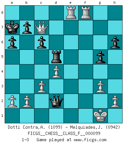 Last move : 1-0 2011 September 25 5:44:24 [Event "FICGS__CHESS__CLASS_F__000099"] [Site "FICGS"] [Date "2011.08.12"] [Round "1"] [White "Dotti Contra,Alessandro"] [Black "Melquiades,Jay"] [Result "1-0"] [WhiteElo "1099"] [BlackElo "0942"] 1.e4 e5 2.Nf3 d6 3.Nc3 c6 4.Bc4 Be6 5.Bxe6 fxe6 6.O-O h6 7.d4 d5 8.Nxe5 Nf6 9.f3 dxe4 10.Nxe4 Nbd7 11.Bf4 g5 12.Nxd7 Nxd7 13.Be3 Rg8 14.g3 Nf6 15.Nxf6+ Qxf6 16.Qd3 Bd6 17.Qh7 O-O-O 18.f4 Bxf4 19.Qe4 Qf7 20.Bxf4 e5 21.Bxe5 Qc4 22.Bf6 Kb8 23.Bxd8 Rxd8 24.c3 a6 25.Qe7 Rd5 26.Rf8+ Ka7 27.Qc7 Qd3 28.Re1 Qd2 29.R1e8 1-0 Philidor's defense Kingside Castling by player White (move 6) Queenside Castling by player Black (move 17) Player White won this chess game. Follow this game move after move (download)No other master has such a terrific will to win. At the board he radiates danger, and even the strongest opponents tend to freeze, like rabbits when they smell a panther. Even his weaknesses are dangerous. As white, his opening game is predictable - you can make plans against it - but so strong that your plans almost never work. In the middle game his precision and invention are fabulous, and in the end game you simply cannot beat him. (Anonymous German Expert) Ein Buch ist ein Spiegel; wenn ein Affe hineinsieht, so kann kein Apostel heraus gucken. (Georg Christoph Lichtenberg) Cuando tengo las piezas blancas, yo gano porque soy blanco; Cuando tengo las piezas negras, yo gano porque soy Bogolyubov. (Bogolyubov) Comme les marins qui ont mille raisons différentes d'aller en mer, les joueurs d'échecs en ont tout autant avant de s'installer devant une table et jouer... (Vincent Bertignac, philosophe) The only thing that matters is the evidence. (Horatio Caine, C.S.I. Miami)