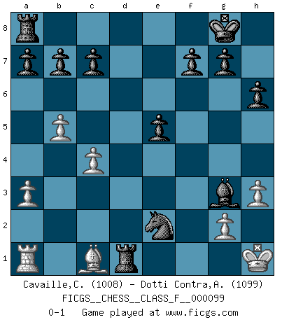 Last move : 0-1 2011 September 24 19:49:52 [Event "FICGS__CHESS__CLASS_F__000099"] [Site "FICGS"] [Date "2011.08.12"] [Round "1"] [White "Cavaille,Cedric"] [Black "Dotti Contra,Alessandro"] [Result "0-1"] [WhiteElo "1008"] [BlackElo "1099"] 1.e4 e5 2.Nf3 Nc6 3.Bc4 h6 4.d4 Bb4+ 5.Nc3 d6 6.O-O Bg4 7.Qe2 Nf6 8.dxe5 dxe5 9.h3 Bh5 10.a3 Ba5 11.Qd2 O-O 12.Qxd8 Rfxd8 13.b4 Bb6 14.b5 Nd4 15.Nxd4 Rxd4 16.Bd3 Rd6 17.Be2 Bxe2 18.Nxe2 Nxe4 19.Ng3 Nxg3 20.Re1 Rd5 21.Kh2 Bxf2 22.Re2 Nxe2 23.c4 Bg3+ 24.Kh1 Rd1+ 0-1 King's pawn game Kingside Castling by player White (move 6) Kingside Castling by player Black (move 11) Player Black won this chess game. Follow this game move after move (download)The older I grow, the more I value Pawns. (Keres) Ich brauche nur einen Blick auf das Schachbrett zu werfen, und weiß schon, was in der Stellung steckt, was geschehen kann und was geschehen wird. Alle übrigen suchen und prüfen, ich aber weiß es! (José Raúl Capablanca) ¿Esta Bobby Fischer algo cuerdo?. (Salo Flohr) Le jeu d'échecs est comme rejeté hors du temps. (Antoine de Saint-Exupéry) The weakness of an artist is dogma. (Josh Waitzkin)