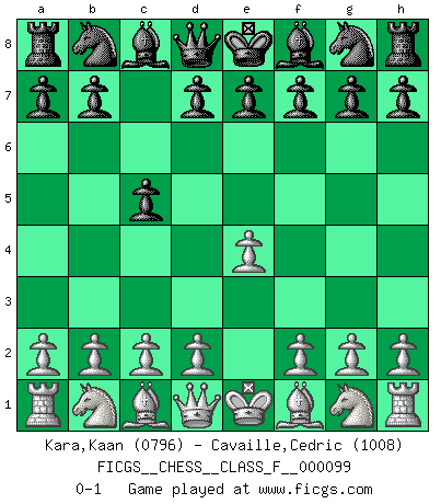 Last move : 0-1 2011 September 23 22:48:42 [Event "FICGS__CHESS__CLASS_F__000099"] [Site "FICGS"] [Date "2011.08.12"] [Round "1"] [White "Kara,Kaan"] [Black "Cavaille,Cedric"] [Result "0-1"] [WhiteElo "0796"] [BlackElo "1008"] 1.e4 c5 0-1 This chess game has been lost on time (started : 2011.08.12 0:4:28) Sicilian defense Player Black won this chess game. Follow this game move after move (download)Chess is a fairy tale of 1001 blunders. (Savielly Tartakower) Wenn Du einsam bist, wenn Du Dich in der Welt wie ein Fremder fühlst, spiele Schach. Das wird Deinen Geist erheben und Dein Ratgeber im Kampf sein. (Aristoteles) La pasion por jugar al Ajedrez es una de las mas inexplicables en el mundo. (H.G. Wells) La conception d'un plan est le processus par lequel un joueur exploite les avantages de sa position tout en s'efforçant d'en réduire au minimum les inconvénients. Afin de garantir le succès, un plan doit toujours se fonder sur un diagnostic objectif des particularités d'une position. La conception d'un plan est d'autant plus difficile que la position est équilibrée, et grandement facilitée lorsqu'il n'existe qu'un seul plan susceptible de répondre aux exigences de la position. (Harry Golombek) Humor is by far the most significant activity of the human brain. (Edward De Bono)