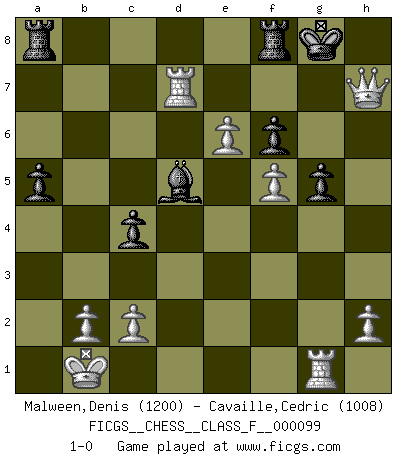 Last move : 1-0 2011 October 8 9:7:20 [Event "FICGS__CHESS__CLASS_F__000099"] [Site "FICGS"] [Date "2011.08.12"] [Round "1"] [White "Malween,Denis"] [Black "Cavaille,Cedric"] [Result "1-0"] [WhiteElo "1200"] [BlackElo "1008"] 1.e4 c5 2.Nf3 d6 3.d4 cxd4 4.Nxd4 Nf6 5.Nc3 e6 6.f3 Be7 7.Be3 O-O 8.g4 d5 9.e5 Nfd7 10.f4 Nc6 11.Qd2 Nxd4 12.Bxd4 a6 13.f5 exf5 14.gxf5 f6 15.e6 Ne5 16.Be2 b5 17.O-O-O Qa5 18.Nxd5 Qxa2 19.Nc3 Qa1+ 20.Nb1 Nc4 21.Qe1 Bd6 22.Bxc4 bxc4 23.Qc3 Bf4+ 24.Be3 Bxe3+ 25.Qxe3 a5 26.Rhg1 Bb7 27.Qh6 g5 28.Rd7 Qxb1+ 29.Kxb1 Bd5 30.Qxh7+ 1-0 Sicilian : Scheveningen variation Kingside Castling by player Black (move 7) Queenside Castling by player White (move 17) Player White won this chess game. Follow this game move after move (download)I love all positions. Give me a difficult positional game, I will play it. But totally won positions, I cannot stand them. (Hein Donner) Es ist wirklich schade, dass so viele Schachspieler nicht auf ihr Äußeres achten! (Alexandra Kosteniuk) Cuando tengas duda... ¡juega al Ajedrez!. (Tevis) Des points faibles ou des trous dans la position de l'adversaire doivent être occupés par des pièces et non pas par des pions. (Siegbert Tarrasch) Memory... is the diary that we all carry with us. (Oscar Wilde, The Importance of Being Earnest)