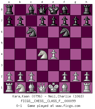 Last move : 0-1 2011 September 22 22:43:22 [Event "FICGS__CHESS__CLASS_F__000099"] [Site "FICGS"] [Date "2011.08.12"] [Round "1"] [White "Kara,Kaan"] [Black "Neil,Charlie"] [Result "0-1"] [WhiteElo "0796"] [BlackElo "1063"] 1.e4 c5 2.Nf3 Nc6 3.d4 cxd4 4.Nxd4 Nf6 0-1 This chess game has been lost on time (started : 2011.08.12 0:4:28) Sicilian defense Player Black won this chess game. Follow this game move after move (download)Chess is the gymnasium of the mind. (Blaise Pascal) Ich habe Kasparov in Rente geschickt. (Veselin Topalov) Uno no tiene que jugar muy bien, es suficiente jugar mejor que el oponente. (Siegbert Tarrasch) Un footballeur joue avec ses pieds, parfois avec sa tête. Un joueur d'échecs ne joue qu'avec sa tête. Et quand il ne joue plus, il meurt. (Jacob Murray) The best weapon against an enemy is another enemy. (Friedrich Nietzsche)