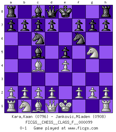 Last move : 0-1 2011 September 21 22:38:4 [Event "FICGS__CHESS__CLASS_F__000099"] [Site "FICGS"] [Date "2011.08.12"] [Round "1"] [White "Kara,Kaan"] [Black "Jankovic,Mladen"] [Result "0-1"] [WhiteElo "0796"] [BlackElo "0908"] 1.e4 e5 2.Nf3 Nc6 3.Bc4 Nf6 4.Ng5 Bc5 0-1 This chess game has been lost on time (started : 2011.08.12 0:4:28) Two knights defense : Wilkes Barre (Traxler) variation Player Black won this chess game. Follow this game move after move (download)Chess is in its essence a game, in its form an art, and in its execution a science. (Baron Tassilo) Schach wird sich dank seiner hohen kulturellen Tradition immer durchsetzen. In näherer Zukunft womöglich sogar als Gegenreaktion auf die maßlose Reizüberflutung im Freizeit- und Spielbereich. (Garry Kasparov) Muchos se han convertido en Maestros de Ajedrez, nadie se ha convertido en el Maestro del Ajedrez. (Siegbert Tarrasch) On croit qu'il y a plus de mauvais joueurs que de bons joueurs, c'est faux : Il y a autant de joueurs qui gagnent que de joueurs qui perdent. (Philippe Geluck) If you know the enemy and know yourself you need not fear the results of a hundred battles. (Sun Tzu)