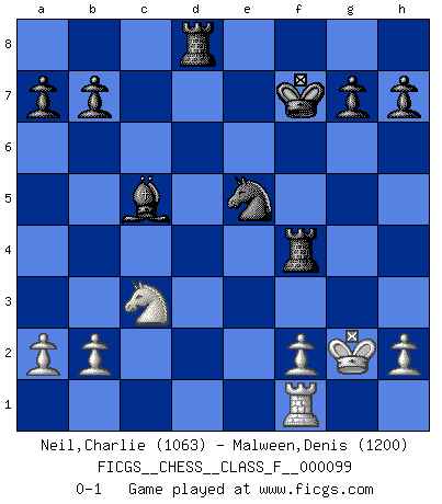 Last move : 0-1 2011 September 23 16:37:47 [Event "FICGS__CHESS__CLASS_F__000099"] [Site "FICGS"] [Date "2011.08.12"] [Round "1"] [White "Neil,Charlie"] [Black "Malween,Denis"] [Result "0-1"] [WhiteElo "1063"] [BlackElo "1200"] 1.e4 c5 2.Nc3 Nc6 3.Nge2 e6 4.g3 Nf6 5.Bg2 d5 6.exd5 Nxd5 7.O-O Be7 8.d4 cxd4 9.Ne4 e5 10.c3 dxc3 11.N2xc3 Be6 12.Nxd5 Bxd5 13.Be3 O-O 14.Rc1 f5 15.Nc3 Bxg2 16.Kxg2 f4 17.gxf4 exf4 18.Qxd8 Raxd8 19.Bxf4 Rxf4 20.Rce1 Kf7 21.Re2 Bc5 22.Re5 Nxe5 0-1 Sicilian : chameleon variation Kingside Castling by player White (move 7) Kingside Castling by player Black (move 13) Player Black won this chess game. Follow this game move after move (download)Examine moves that smite! A good eye for smites is far more important than a knowledge of strategical principles. (Purdy) Es tut gut, die Entwicklungsperiode von, [...] demokratischem Geist durchdringen zu lassen. Wie undemokratisch wäre es doch beispielsweise, den einen Offizier große Spaziertouren vornehmen zu lassen, während die anderen zu Hause säßen und sich entsetzlich langweilten. (Aaron Nimzowitsch) Aún el Rey más flojo huye despavorido ante la amenaza de un Jaque doble. (Aaron Nimzowitsch) A chaque perte on perd un peu de soi. (Joël Lautier) Hello Thibault, if I have had a plan (and I had one, I hope), I have forgotten it during the last week... - Hello Heinz-Georg. What do you mean a plan ? (Anonymous players, during a Big Chess game)