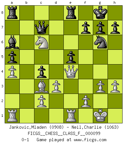 Last move : 0-1 2011 December 25 17:19:52 [Event "FICGS__CHESS__CLASS_F__000099"] [Site "FICGS"] [Date "2011.08.12"] [Round "1"] [White "Jankovic,Mladen"] [Black "Neil,Charlie"] [Result "0-1"] [WhiteElo "0908"] [BlackElo "1063"] 1.e4 c5 2.Nf3 Nc6 3.Bb5 e6 4.Bxc6 bxc6 5.Nc3 d5 6.d3 Nf6 7.e5 Nd7 8.O-O a6 9.b3 a5 10.a4 Qc7 11.Re1 Ba6 12.Bb2 c4 13.bxc4 Bb4 14.Nd4 Nxe5 15.h3 dxc4 16.Qe2 Ng6 17.g3 O-O 18.Qe4 e5 19.Nxc6 Bxc3 20.Bxc3 Rfe8 0-1 This chess game has been lost on time (started : 2011.08.12 0:4:28) Sicilian : Nimzovich-Rossolimo attack (without ...d6) Kingside Castling by player White (move 8) Kingside Castling by player Black (move 17) Player Black won this chess game. Follow this game move after move (download)The passed Pawn is a criminal, who should be kept under lock and key. Mild measures, such as police surveillance, are not sufficient. (Aaron Nimzovich) Wer mein Gambit spielt, muß bereit sein, alle Brücken hinter sich abzubrechen. Es verändert den ganzen Menschen. Es wirkt wie ein Zauberstab und fördert verkümmerte, gute Charakter- eigenschaften wieder zu Tage. (Emil Joseph Diemer) Nunca antes ha habido un jugador de Ajedrez con tal conocimiento a fondo de las complejidades del juego y una inmensa voluntad absolutamente indomable de ganar. Yo pienso que Fischer es el jugador mas grande que jamás haya existido. (Lisa Lane) On a dit que l'homme se distingue de l'animal par le fait qu'il achète plus de livres qu'il ne peut en lire. Je voudrais suggérer qu'inclure à la liste des livres quelques livres d'échecs rendrait la distinction manifeste. (Edward Lasker) To steal ideas from one person is plagiarism. To steal from many is research. (Unknown)