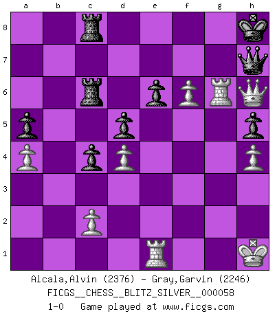 Last move : 1-0 2011 August 12 9:43:28 [Event "FICGS__CHESS__BLITZ_SILVER__000058"] [Site "FICGS"] [Date "2011.08.12"] [Round "1"] [White "Alcala,Alvin"] [Black "Gray,Garvin"] [Result "1-0"] [WhiteElo "2376"] [BlackElo "2246"] 1.e4 e6 2.d4 d5 3.Nc3 Bb4 4.e5 c5 5.a3 Bxc3+ 6.bxc3 Ne7 7.a4 Nbc6 8.Nf3 Qa5 9.Bd2 Bd7 10.Bb5 c4 11.O-O h6 12.Qb1 O-O 13.Nh4 Rab8 14.f4 a6 15.Bxc6 bxc6 16.Qa2 c5 17.Qa3 Rfc8 18.Be1 Qb6 19.Ra2 Qd8 20.dxc5 Qc7 21.Bf2 Rb7 22.Qc1 Rcb8 23.Bd4 Bc6 24.g4 Ng6 25.Ng2 Bd7 26.Qe1 Ne7 27.Ra1 a5 28.Qg3 Nc6 29.f5 Qd8 30.h4 Rb2 31.Ne3 R2b7 32.g5 h5 33.g6 fxg6 34.f6 Be8 35.Ng2 Bf7 36.Rae1 Kh8 37.Nf4 Qg8 38.Kh1 Rd7 39.Rg1 gxf6 40.exf6 Kh7 41.Nh3 Kh8 42.Ng5 Rc8 43.Qf4 Nxd4 44.cxd4 Rdc7 45.c6 Rxc6 46.Nxf7+ Qxf7 47.Qh6+ Qh7 48.Rxg6 1-0 French : Winawer, Advance, Smyslov variation Kingside Castling by player White (move 11) Kingside Castling by player Black (move 12) Player White won this chess game. Follow this game move after move (download)You can only get good at Chess if you love the game. (Bobby Fischer) Schach ist eine Sache der genauen Beurteilung, wann man zuschlagen und wann man sich ducken muss. (Robert James Fischer) Robert Fischer es la ley hacia si mismo. (Larry Evans) Aux échecs, l'amour-propre est satisfait quand on remporte la victoire, mais il n'y a pas de honte à être battu. (Benjamin Franklin) Wisdom doesn't necessarily come with age. Sometimes age just shows up all by itself. (Tom Wilson)