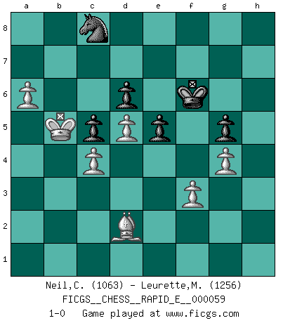 Last move : 1-0 2011 October 3 9:55:25 [Event "FICGS__CHESS__RAPID_E__000059"] [Site "FICGS"] [Date "2011.08.12"] [Round "1"] [White "Neil,Charlie"] [Black "Leurette,Marc-Antoine"] [Result "1-0"] [WhiteElo "1063"] [BlackElo "1256"] 1.e4 e5 2.Nf3 Nc6 3.d4 exd4 4.Nxd4 Nf6 5.Nc3 Bb4 6.Ndb5 Bxc3+ 7.Nxc3 d6 8.Bg5 h6 9.Bh4 Bd7 10.Bc4 Be6 11.Qe2 Bxc4 12.Qxc4 Qd7 13.O-O-O O-O-O 14.f3 Qe6 15.Qxe6+ fxe6 16.Rhe1 g5 17.Bf2 e5 18.Nd5 Nxd5 19.exd5 Nb4 20.a3 Na6 21.b4 b6 22.h4 Rhg8 23.g4 Rdf8 24.Rd3 Kd7 25.hxg5 hxg5 26.Rh1 c5 27.Rh7+ Ke8 28.Rxa7 Nb8 29.bxc5 bxc5 30.Rb3 Nd7 31.R3b7 Rg7 32.Ra8+ Ke7 33.Rxf8 Kxf8 34.a4 Nf6 35.Rxg7 Kxg7 36.c4 Nd7 37.Be3 Kg6 38.Kc2 Nb6 39.Kb3 Kf6 40.a5 Nc8 41.Ka4 Na7 42.a6 Nc6 43.Bd2 Na7 44.Ka5 Nc8 45.Kb5 1-0 Scotch : Schmidt variation Queenside Castling by player White (move 13) Queenside Castling by player Black (move 13) Player White won this chess game. Follow this game move after move (download)The Pin is mightier than the sword. (Fred Reinfeld) Auf Remis zu spielen ist gewissermaßen ein Verbrechen gegen das Schachspiel. (Mikhail Nekhemyevich Tal) Un jugador que trata de regresar una movida en el Ajedrez es un futuro carterista. (Richard Fenton) Il n'y a pas de prix trop élevé au scalp de l'ennemi. (Koblentz) Art disturbs, science reassures. (Georges Braque, Le Jour et la Nuit)