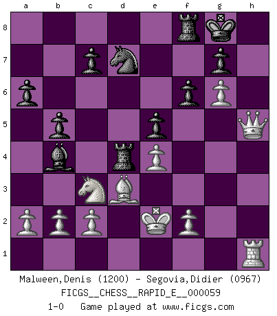 Last move : 1-0 2011 September 16 22:12:0 [Event "FICGS__CHESS__RAPID_E__000059"] [Site "FICGS"] [Date "2011.08.12"] [Round "1"] [White "Malween,Denis"] [Black "Segovia,Didier"] [Result "1-0"] [WhiteElo "1200"] [BlackElo "0967"] 1.e4 e5 2.Nf3 d6 3.d4 Bg4 4.dxe5 Bxf3 5.Qxf3 dxe5 6.Bc4 Nf6 7.Nc3 Bb4 8.Bg5 O-O 9.Rd1 Nbd7 10.Bxf6 Nxf6 11.Rxd8 Raxd8 12.Ke2 a6 13.h4 h6 14.g4 Rd4 15.Bd3 b5 16.g5 hxg5 17.hxg5 Nd7 18.Qh5 f6 19.g6 1-0 Philidor's defense Kingside Castling by player Black (move 8) Player White won this chess game. Follow this game move after move (download)In order to improve your game, you must study the endgame before everything else, for whereas the endings can be studied and mastered by themselves, the middle game and the opening must be studied in relation to the endgame. (Jose Raul Capablanca) Ich möchte Schüler heranbilden, die das Vermögen haben, selbst zu denken und Kritik zu üben. (Emanuel Lasker) Los problemas de Ajedrez exigen del compositor las mismas virtudes que caracterizan todo el arte de valor: originalidad, invención, concisión, armonía, complejidad e insinceridad explendida. (Vladimir Nabokov) Il (Jacob Murray) ne joue pas pour le bon coup, mais pour le meilleur. (Eloi Relange) Players are not good because they find tactics, it is about the way to find the positions in which those tactics are hidden. (Luc-Olivier Leclerc)