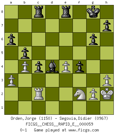Last move : 0-1 2011 October 12 18:55:48 [Event "FICGS__CHESS__RAPID_E__000059"] [Site "FICGS"] [Date "2011.08.12"] [Round "1"] [White "Orden,Jorge"] [Black "Segovia,Didier"] [Result "0-1"] [WhiteElo "1150"] [BlackElo "0967"] 1.e4 e5 2.Nf3 d6 3.Be2 Nf6 4.Nc3 g6 5.O-O Bg7 6.h3 O-O 7.d3 Nc6 8.a3 Nh5 9.Nh2 Nd4 10.Be3 c5 11.Nd5 Be6 12.c4 Bxd5 13.Bxh5 Bxe4 14.dxe4 gxh5 15.Qxh5 Qf6 16.Ng4 Qg6 17.Qxg6 fxg6 18.Bxd4 cxd4 19.b4 a6 20.f4 exf4 21.Rad1 Rae8 22.Nf2 b6 23.Rfe1 Rc8 24.Rc1 Bh6 25.Rc2 Rfe8 26.Rd1 Bg7 27.Rd3 b5 28.c5 dxc5 29.Kh2 c4 30.Rxd4 Bxd4 0-1 Philidor's defense Kingside Castling by player White (move 5) Kingside Castling by player Black (move 6) Player Black won this chess game. Follow this game move after move (download)My opponents make good moves too. Sometimes I don't take these things into consideration. (Bobby Fischer) Wenn Du einsam bist, wenn Du Dich in der Welt wie ein Fremder fühlst, spiele Schach. Das wird Deinen Geist erheben und Dein Ratgeber im Kampf sein. (Aristoteles) Siempre es mucho mejor sacrificar las piezas de tu oponente. (Savielly Tartakover) On croit qu'il y a plus de mauvais joueurs que de bons joueurs, c'est faux : Il y a autant de joueurs qui gagnent que de joueurs qui perdent. (Philippe Geluck) The right perception of any matter and a misunderstanding of the same matter do not wholly exclude each other. (Kafka's the trial)