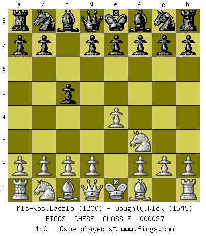 Last move : 1-0 2007 February 9 15:34:58 [Event "FICGS__CHESS__CLASS_E__000027"] [Site "FICGS"] [Date "2006.12.31"] [Round "1"] [White "Kis-Kos,Laszlo"] [Black "Doughty,Rick"] [Result "1-0"] [WhiteElo "1200"] [BlackElo "1545"] 1.e4 c5 2.Nf3 1-0 This chess game has been lost on time (started : 2006.12.31 7:58:24) Sicilian defense Player White won this chess game. Follow this game move after move (download)Life is a kind of Chess, with struggle, competition, good and ill events. (Benjamin Franklin) Woher wissen wir, daß der Neanderthaler Blindschach gespielt hat? -- Bei Ausgrabungen wurden keine Schachbretter und Figuren gefunden. (Anonymous) Botvinnik trataba de restarle el misterio al Ajedrez, siempre relacionandolo a situaciones de la vida ordinaria. El gustaba de llamar al Ajedrez un típico problema inexacto similar a aquellos de los cuales la gente siempre tiene que enfrentarse en la vida cotidiana. (Garry Kasparov) Les Echecs, c'est l'art de la guerre sans les charniers, c'est la résurrection des morts tombés au champ d'honneur, l'espoir perpétuel, la suprématie de l'intelligence sur la force, la culture de l'esprit. (F. Szpiner) The human is the only animal species whose members are able to talk themselves into difficulties that would not otherwise exist. (Wendell Johnson)