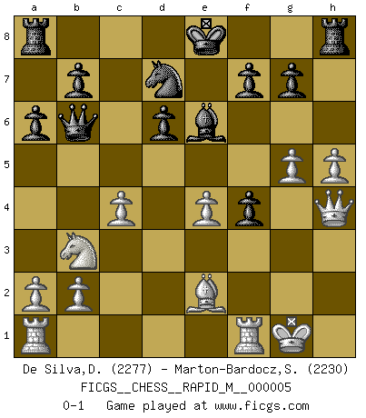 Last move : 0-1 2007 May 9 17:40:6 [Event "FICGS__CHESS__RAPID_M__000005"] [Site "FICGS"] [Date "2007.01.01"] [Round "1"] [White "De Silva,Dinesh"] [Black "Marton-Bardocz,Sandor"] [Result "0-1"] [WhiteElo "2277"] [BlackElo "2230"] 1.e4 c5 2.Nf3 d6 3.d4 cxd4 4.Nxd4 Nf6 5.Nc3 a6 6.Be2 e5 7.Nb3 Be7 8.O-O Be6 9.f4 Qc7 10.g4 h6 11.g5 hxg5 12.fxg5 Nh7 13.h4 Nf8 14.Nd5 Qd8 15.Qe1 Ng6 16.Nxe7 Nxe7 17.Be3 Nd7 18.c4 Ng6 19.h5 Nf4 20.Bxf4 exf4 21.Qh4 Qb6+ 0-1 Sicilian : Najdorf, Opovcensky variation Kingside Castling by player White (move 8) Player Black won this chess game. Follow this game move after move (download)Though most people love to look at the games of the great attacking masters, some of the most successful players in history have been the quiet positional players. They slowly grind you down by taking away your space, tying up your pieces, and leaving you with virtually nothing to do ! (Yasser Seirawan) Wir irren allesamt, nur jeder irrt anders. (Georg Christoph Lichtenberg) Tu eres para mi la Reina en d8 y yo soy el Peón en d7!!. (GM Eduard Gufeld) Votre prénom est 'Tactique', votre deuxième prénom est 'Tactique' et votre nom est 'Tactique'. (Ken Smith) A journey of a thousand sites begins with a single click. (Author unknown)