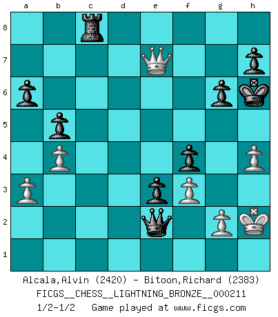 Last move : 1/2-1/2 2011 August 13 18:50:38 [Event "FICGS__CHESS__LIGHTNING_BRONZE__000211"] [Site "FICGS"] [Date "2011.08.13"] [Round "1"] [White "Alcala,Alvin"] [Black "Bitoon,Richard"] [Result "1/2-1/2"] [WhiteElo "2420"] [BlackElo "2383"] 1.e4 c5 2.Nf3 d6 3.d4 cxd4 4.Nxd4 Nf6 5.Nc3 a6 6.Be3 e5 7.Nb3 Be6 8.Be2 Be7 9.Nd5 Nxd5 10.exd5 Bf5 11.Qd2 O-O 12.O-O Bg6 13.c4 Nd7 14.Na5 f5 15.f3 f4 16.Bf2 Rb8 17.b4 Bh4 18.Bd3 Bxf2+ 19.Rxf2 Bxd3 20.Qxd3 Nf6 21.h3 Re8 22.a3 Qb6 23.Re1 Qa7 24.Qd2 Rbc8 25.Qd3 g6 26.Rd1 e4 27.Qc3 e3 28.Re2 Nh5 29.c5 Red8 30.Qc4 b5 31.Qa2 Ng3 32.Nc6 Nxe2+ 33.Qxe2 Qf7 34.Nxd8 Rxd8 35.c6 Re8 36.Qd3 Qe7 37.Kh2 Qg5 38.Kg1 Qe5 39.Kh2 Qg5 40.Kh1 Qe5 41.Re1 Qb2 42.Re2 Qc1+ 43.Kh2 Qa1 44.h4 Qc1 45.Qd4 Qf1 46.Qb2 Qd1 47.c7 Qxd5 48.Qf6 Qc4 49.Qxd6 Qxe2 50.c8Q Rxc8 51.Qe6+ Kg7 52.Qe7+ Kh6 53.Qg5+ Kg7 54.Qe7+ Kh6 1/2-1/2 Sicilian : Najdorf, Byrne (English) attack Kingside Castling by player Black (move 11) Kingside Castling by player White (move 12) Promotion Queen by player White (move 50) This chess game ended in a draw. Follow this game move after move (download)Fischer prefers to enter Chess history alone. (Miguel Najdorf) Lisa Lane, amerikanische Schachmeisterin, hatte Fischer einmal als stärksten lebenden Spieler bezeichnet. Antwort: Das ist richtig, aber Lisa Lane ist eigentlich nicht in der Lage, das zu beurteilen. (Robert James Fischer) Un entendimiento minucioso de las típicas continuaciones de mate hacen de las mas complicadas combinaciones de sacrificio que conducen hacia ellas no solo no dificiles, sino casi un asunto de rutina. (Siegbert Tarrasch) Une platitude souvent récitée à propos des Echecs est qu'une des choses les plus difficiles à réaliser est de gagner une position gagnante. Cela ne manque pas de sens mais, pour ma part, j'ai toujours trouvé plus difficile de gagner une position perdante. (Tim Krabbe) Fear is the path to the dark side. Fear leads to anger; anger leads to hate; hate leads to suffering. I sense much fear in you. (Master Yoda in Star Wars ep.1)