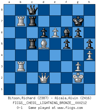Last move : 0-1 2011 August 13 21:19:54 [Event "FICGS__CHESS__LIGHTNING_BRONZE__000212"] [Site "FICGS"] [Date "2011.08.13"] [Round "1"] [White "Bitoon,Richard"] [Black "Alcala,Alvin"] [Result "0-1"] [WhiteElo "2387"] [BlackElo "2416"] 1.e4 c5 2.Nf3 d6 3.d4 cxd4 4.Nxd4 Nf6 5.Nc3 a6 6.Be2 e5 7.Nb3 Be7 8.O-O O-O 9.Qd3 Be6 10.Rd1 Nbd7 11.Nd5 Bxd5 12.exd5 Rc8 13.c4 Ne8 14.Qh3 f5 15.Nd2 a5 16.Nf3 Nc7 17.Rb1 Na6 18.b3 Nac5 19.Be3 g6 20.Nd2 Rf7 21.a3 Nf6 22.Rbc1 Na6 23.b4 axb4 24.axb4 Nxb4 25.Rb1 Na6 26.Rxb7 Nc5 27.Bxc5 Rxc5 28.Rdb1 Rc7 29.Rb8 Rc8 30.R8b5 Nd7 31.Nb3 Bg5 32.Qc3 e4 33.Qb4 Bf4 34.Nd4 Nc5 35.Ne6 Nxe6 36.dxe6 Rfc7 37.g3 Be5 38.Qd2 Kg7 39.f4 exf3 40.Bxf3 Rxc4 41.Bd5 R4c5 42.Rb7+ R8c7 43.Kg2 h5 44.h4 Qc8 45.R1b3 Bf6 0-1 Sicilian : Najdorf, Opovcensky variation Kingside Castling by player White (move 8) Kingside Castling by player Black (move 8) Player Black won this chess game. Follow this game move after move (download)Don't even mention losing to me. I can't stand to think of it. (Bobby Fischer) Die starken Figuren des Gegners muss man abtauschen. (José Raúl Capablanca) El Ajedrez demanda una total concentración. (Bobby Fischer) Dieu déplace le joueur, et celui-ci la pièce. Quel Dieu derrière Dieu commence donc la trame ? Arturo Perez-Reverte (prix de littérature policière 1993). Ah, beer! The cause of, and the solution to, all of life's problems. (Homer Simpson)