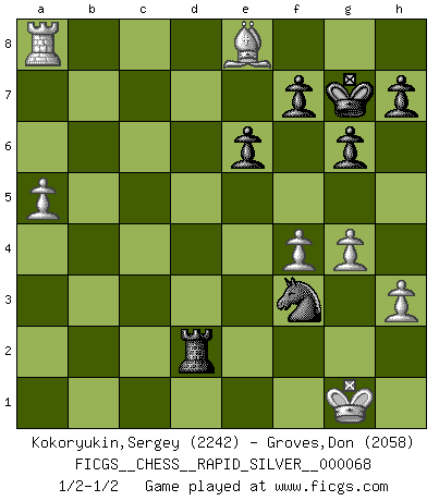 Last move : 1/2-1/2 2011 October 22 10:36:54 [Event "FICGS__CHESS__RAPID_SILVER__000068"] [Site "FICGS"] [Date "2011.08.14"] [Round "1"] [White "Kokoryukin,Sergey"] [Black "Groves,Don"] [Result "1/2-1/2"] [WhiteElo "2242"] [BlackElo "2058"] 1.d4 Nf6 2.c4 e6 3.Nf3 d5 4.e3 Be7 5.Nc3 c5 6.dxc5 Bxc5 7.a3 O-O 8.b4 Be7 9.Qc2 a5 10.b5 Nbd7 11.Bb2 Nb6 12.Na4 Bd7 13.Nxb6 Qxb6 14.Bd4 Qc7 15.Qb2 dxc4 16.Ne5 c3 17.Bxc3 Rac8 18.Bd4 Bc5 19.Bxc5 Qxc5 20.Bd3 Qd5 21.O-O Rc5 22.Nxd7 Qxd7 23.Rfd1 Qc7 24.b6 Qc6 25.Rac1 Rc8 26.Rxc5 Qxc5 27.Be2 Nd5 28.Bf3 Qxb6 29.Qxb6 Nxb6 30.Bxb7 Rb8 31.Ba6 Kf8 32.Rc1 g6 33.g3 Nd5 34.a4 Nf6 35.Bb5 Ne4 36.Rc6 Rd8 37.f4 Rd1+ 38.Kg2 Rd2+ 39.Kg1 Nf6 40.Ra6 Nd5 41.Rxa5 Nxe3 42.Bc6 Ng4 43.h3 Ne3 44.Ra8+ Kg7 45.a5 Nf5 46.g4 Nd4 47.Be8 Nf3+ 1/2-1/2 Queen's pawn game Kingside Castling by player Black (move 7) Kingside Castling by player White (move 21) This chess game ended in a draw. Follow this game move after move (download)Chess is a fairy tale of 1001 blunders. (Savielly Tartakower) Wenn ich gewinne bin ich ein Genie. Wenn nicht, dann bin ich keines. (Robert James Fischer) ¿Se han dado cuenta de que Fischer casi nunca ha tenido piezas malas? El las intercambia y las piezas malas se quedan con sus oponenets. (Yuri Balashov) Le thème de l'attaque double intervient d'une manière ou d'une autre dans l'immense majorité des combinaisons. (Youri Averbakh) Quotation,n.: The act of repeating erroneously the words of another. The words erroneously repeated. (Ambrose Bierce, The Devil's Dictionary)